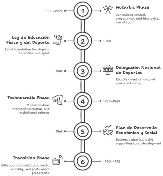 By the late 1950s, political isolation and flawed economic policies had pushed Spanish society toward collapse. Indicators of the crisis included rising living costs, growing public debt, shrinking reserves, a widening trade deficit, inflation reaching 42 pesetas per U.S. dollar, and unsustainable public spending. This critical situation demanded substantial reform to avoid systemic failure. It created an opening for the School of Public Administration in Alcalá de Henares and reformist figures within the regime—particularly Laureano López Rodó and Luis Carrero Blanco—to advocate for internal change. Nonetheless, this period was marked by tensions between hardline and reformist factions within Francoism. The regime remained ambivalent: while the repression of political dissent persisted, efforts were also made to improve the population’s material and economic conditions. Figure 1 illustrates the key phases in the evolution of Francoist sport.