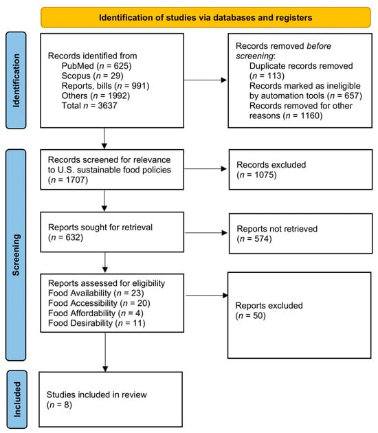 A total of 632 articles were identified: 611 from PubMed and 21 from Scopus. Even though there are several policies created by the United States government and research institutions, most of them were implemented in school settings between 2013 and 2016 [22] and do not address the sustainability problems that have been identified in recent years, nor do they target the transformation of food systems that improve health and have environmental benefits. A comprehensive article screening and criteria are shown in Figure 2, which illustrates the methodology used in the narrative review, including identification, screening, eligibility, and inclusion of sources, with categorization under the four policy domains: availability, accessibility, affordability, and desirability.