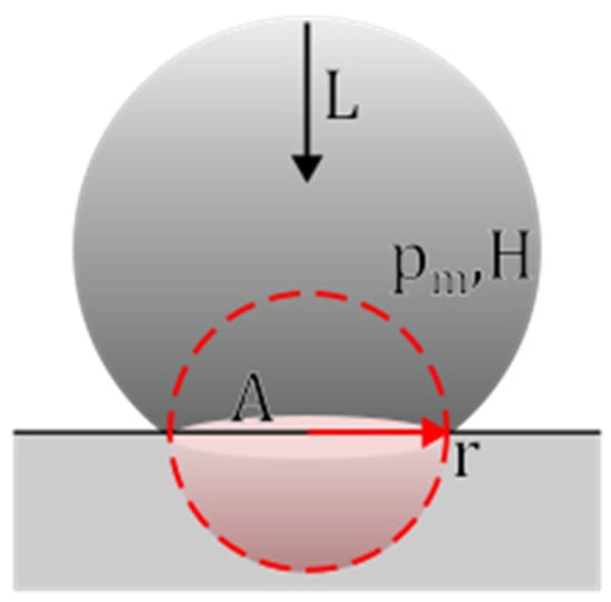 The above adhesive wear law can be derived following the details stated by Halling [4] and Figure 1. The wear volume per sliding distance for n spherically shaped asperities approximates from the worn volume as a half sphere, which is proportional to contact area A. If is the yield pressure, or hardness, then the normal load is . Therefore, the wear volume per sliding distance is . Given that not all contacts produce wear, and not all asperities wear at the same rate, the wear coefficient is introduced to yield Equation (1). Originally introduced for adhesive wear, the equation has also been shown to be applicable to simple abrasive wear [4,5,6]. Further applications have extended to fretting and oxidative wear by slightly adjusting the model to include the hardness of the tribologically altered surface layer formed during wear [7]. Given its foundational role and continued relevance, Archard’s equation deserves a reevaluation using modern analysis techniques.