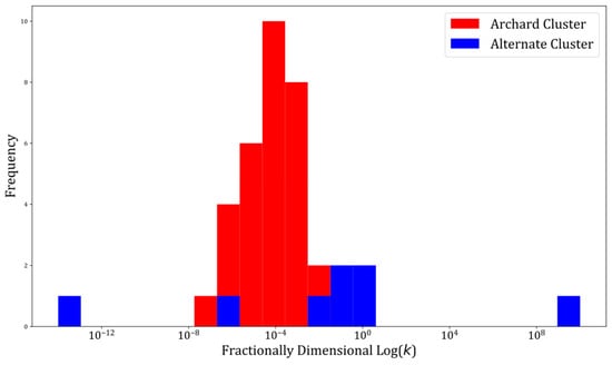 Delaney et al. [9] conducted a calibration study where a volumetric form of Equation (3) was fit to wear data collected from diverse wear studies. Of the 75 wear experiments reviewed, only 39 presented their data in a manner sufficient to support the calibration task. The fitted exponents were plotted and clustered using a Gaussian Mixture Model into two groups: one reflecting models resembling the original Archard model, and the other reflecting variant models, named the Alternate cluster. Regarding the previously mentioned loss of its dimensionless quality in Equation (3), a histogram of calibrated wear coefficients is provided in Figure 2. For extreme fits (i.e., those belonging to the Alternate cluster), k values are pushed to extremes and deviate from the approximate log-normal distribution observed by fits clustered near the classic Archard model (i.e., ).