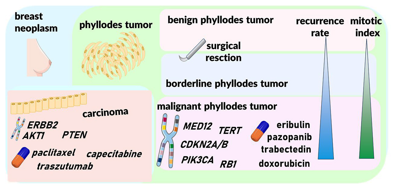 - Bansal, R.; Adeyelu, T.; Elliott, A.; Tan, A.R.; Ribeiro, J.R.; Meisel, J.; Oberley, M.J.; Graff, S.L.; Sledge, G.W., Jr.; Grilley-Olson, J.E.; et al. Genomic Landscape of Malignant Phyllodes Tumors Identifies Subsets for Targeted Therapy. JCO Precis. Oncol. 2024, 8, e2400289. [Google Scholar] [CrossRef] [PubMed]