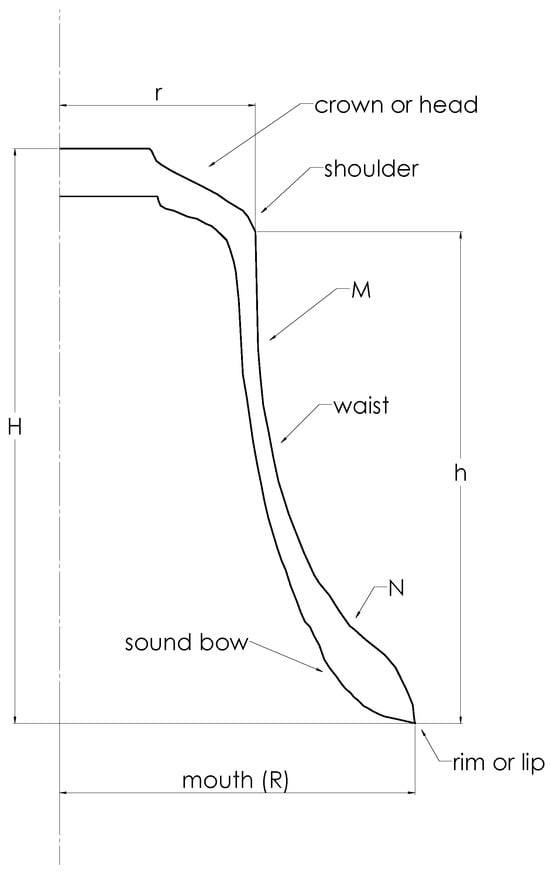 It should be noted that the inner and outer profiles are different, although in this paper, we are mainly concerned with the outer one. The depressions seen on the inner profile show where the founder has removed metal in an axisymmetric way to tune some partials. As with most modern bells, there are no “cannons” cast into the crown for hanging purposes. Parameters of importance in describing the outer profiles are the mouth radius (R), the shoulder radius (r), and the vertical heights above the mouth of the crown (H) and of the shoulder (h). The values of these parameters for the Taylor church bell in Figure 2 are R = 349 mm, r = 192 mm, H = 565 mm, and h = 484 mm (these values differ slightly from those in the preliminary study because we now have access to more sophisticated data-fitting software, namely SolidWorks 2022/3). Some small ambiguities arise over precisely where the shoulder and, to a lesser extent, the rim are considered to be located. These are discussed in Section 4.2 below. Such ambiguities do not occur in most handbells, where the shoulder and rim are both sharply defined in most cases [].
