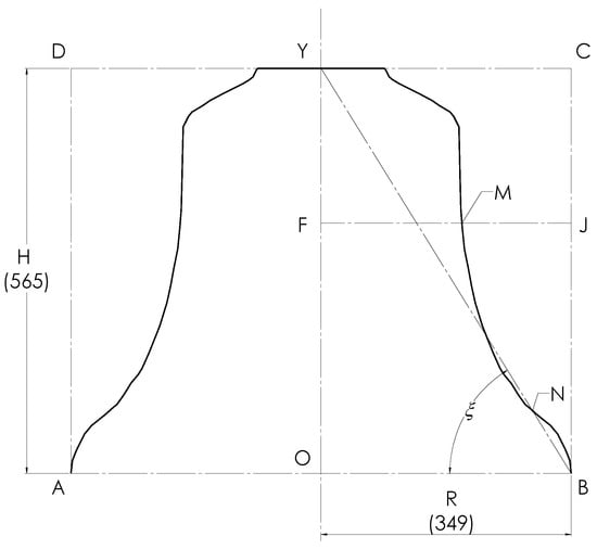 Figure 3 shows the complete outer profile of the Taylor church bell. Since it has R = 349 mm and H = 565 mm, it follows that H/R = 1.619, which is almost identical to the golden ratio of 1.618, so the rectangle OBCY is almost exactly golden. As a convenient alternative measure of its “goldenness”, we join the rim at B to the centre of the crown at Y and measure the angle , which this makes with the mouth. Clearly = tan−1(H/R), which gives = 58.30° in this case. As expected, this compares very favourably with the golden value of G = tan−1 () = 58.28°. This angle () is the first of the “goldenness” parameters mentioned in the introduction. The larger rectangle (ABCD), containing the entire bell, is built up of two identical golden rectangles lying side by side. The diagonal (BY) of the right-hand rectangle cuts the outer profile in two places. The lower of these coincides with N, the morphing point from the elliptical-to-circular arcs.