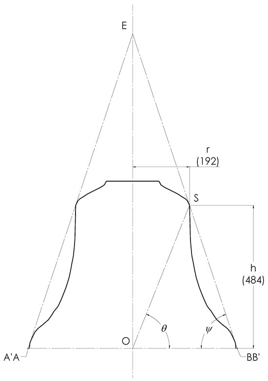 The question of where to take the shoulder location—as mentioned earlier in the context of small ambiguities surrounding the values of r and h—now needs to be addressed. There are several possibilities, but we find the most satisfactory one is to draw the common tangent to the shoulder and the sound bow regions and take the point S, where it touches the shoulder region, as its location. An alternative, which some founders seem to prefer, is to extrapolate the linear part of the wall upwards and take the point at which this intersects with an extrapolation of the approximately flat, downwards sloping part of the lower crown (not to be mistaken with the perfectly flat, horizontal part of the upper crown) outwards. A third possibility, which we have used in Figure 2 and Figure 4, is simply to take the upper end of the linear part of the profile. The numerical differences introduced by these approaches are so small that for simplicity, we shall treat them all as being identical. Nevertheless, we include some uncertainty analysis subsequently. In Figure 5, we again show the Taylor church bell but now with the common tangent on the right extrapolated to cut the symmetry axis at E and the plane of the mouth at B′. For this Taylor church bell, the difference between the lip (B) and the intercept (B′) is, again, so small that we shall treat them as identical. The tangent BE plus its mirror image in the symmetry axis (AE) and the baseline AOB form an isosceles triangle (ABE). We are interested in the angle OBE ≡ given by