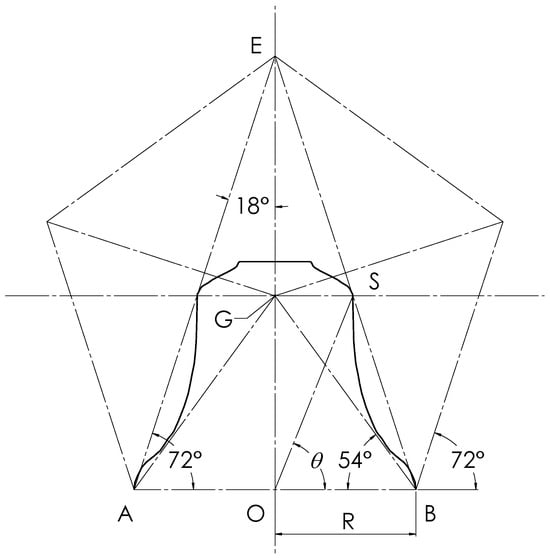 With reference to Figure 6, it is required to evaluate the angle that is hypothesised to be almost equal to the golden angle. The angle values shown in the figure all come directly from the standard geometry of the regular pentagon. It should be remembered that the line OB is equal in length to the radius of the bell’s rim, previously designated as R. Also, because GS is parallel to OB, it follows that LGSO = and that LGSE = 72°. From triangle OBE, we have