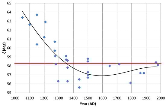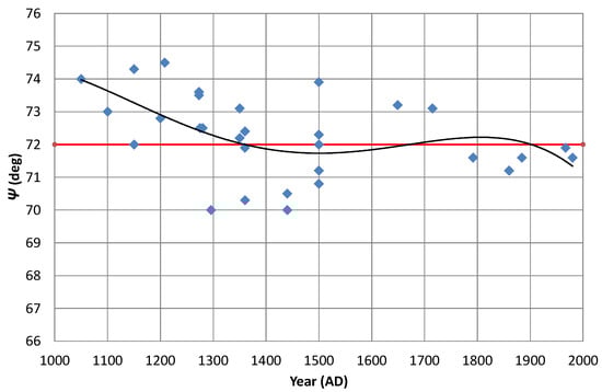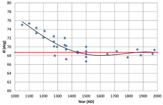 Here, we will consider the ways in which the golden parameters (, , and )—introduced in Section 4 to characterise the outer profiles of English church bells—have varied over the last millennium. Their behaviours in this regard are shown graphically in Figure 7, Figure 8, and Figure 9, respectively. Trend lines (while polynomial order four is used, there is no basis for this choice other than that it seems to fit the argumentation quite well) have been added, as they seem to be helpful to track the changes over time together with indications of their golden values.