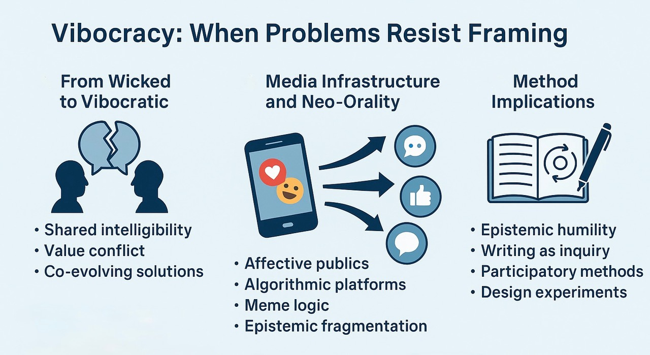 Traditional problem-solving models falter under vibocratic conditions. Linear planning assumes stable problem definitions [58]. Evidence-based policymaking assumes shared criteria of validity [59]. Even classical deliberative democracy assumes publics who can engage in reasoned argument [60]. Vibocracy disrupts these assumptions, suggesting that researchers and practitioners may need to explore new ways of knowing, writing, and acting.