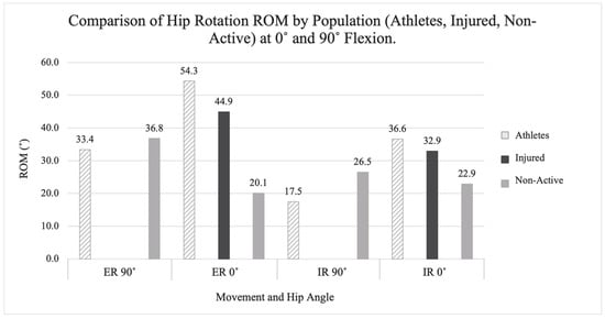 Comparison of hip rotation ROM by population and hip flexion measurement angle [18,19,20,21,22,23,24,25,26]. Note: Bars represent average values pooled from the included studies for each population. Values for injured participants at ER 90° and IR 90° were not available. Abbreviations: ROM: range of motion, IR: internal rotation, ER: external rotation.