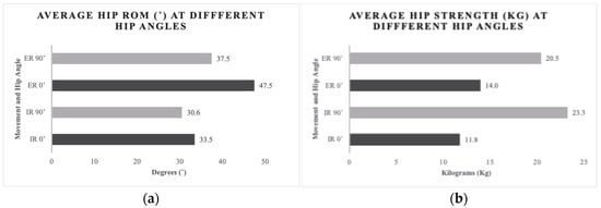 Figure 2 summarizes the pooled average values for hip IR and ER and strength at 0° and 90° of hip flexion across all studies. Both ROM and strength varied with hip testing angle, with IR and ER ROM showing lower values at 90° compared to 0°. On the contrary, for hip rotator strength, Figure 2b illustrates that hip rotator strength increases substantially when measured at 90° compared with 0° of hip flexion for both muscle groups. At 0°, ERs demonstrated greater strength than IRs (14 kg vs. 11.8 kg). However, at 90°, this relationship reversed, with IRs reaching 23.3 kg compared to 20.5 kg for ERs.