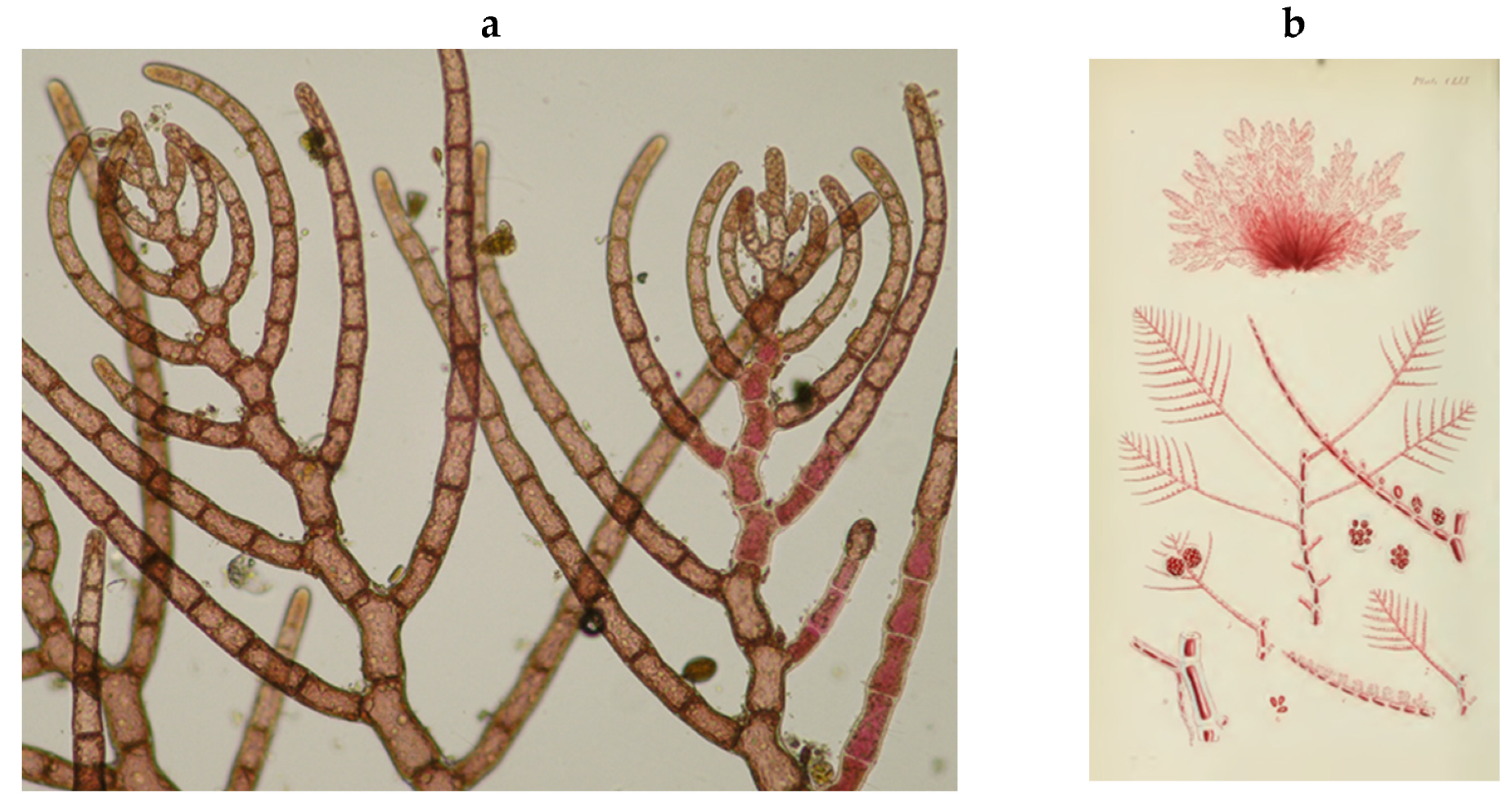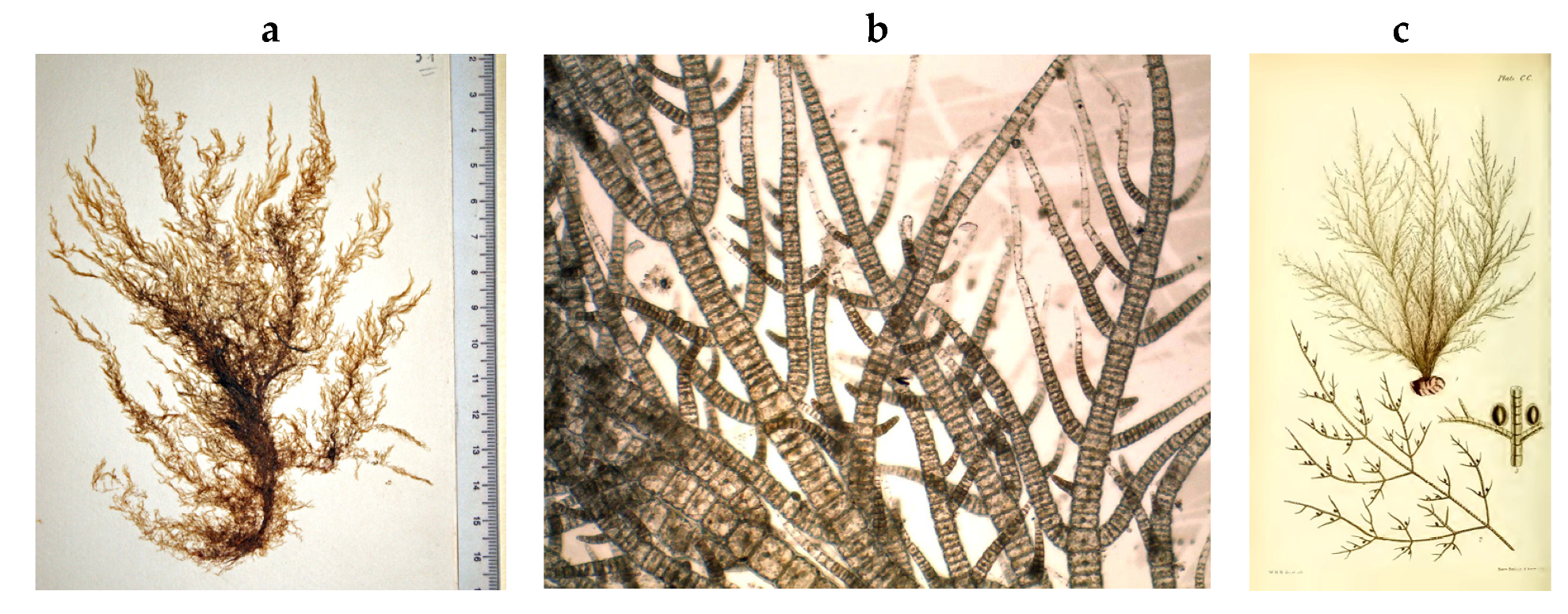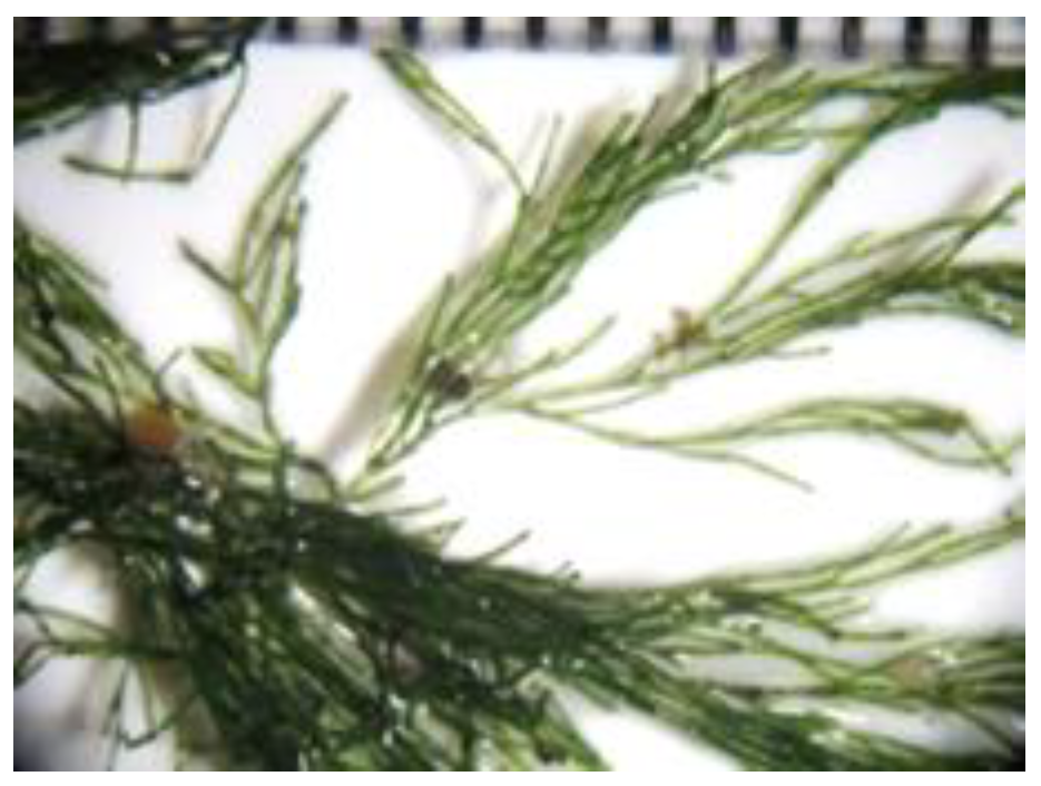 Description: Filaments are rigid, erect, and setaceous, with a deep dark green coloration. They exhibit di-trichotomous branching, with very acute axils and upright branches. Articulations are many times longer than they are broad, and dissepiments are present only at the points where branches and ramuli fork.