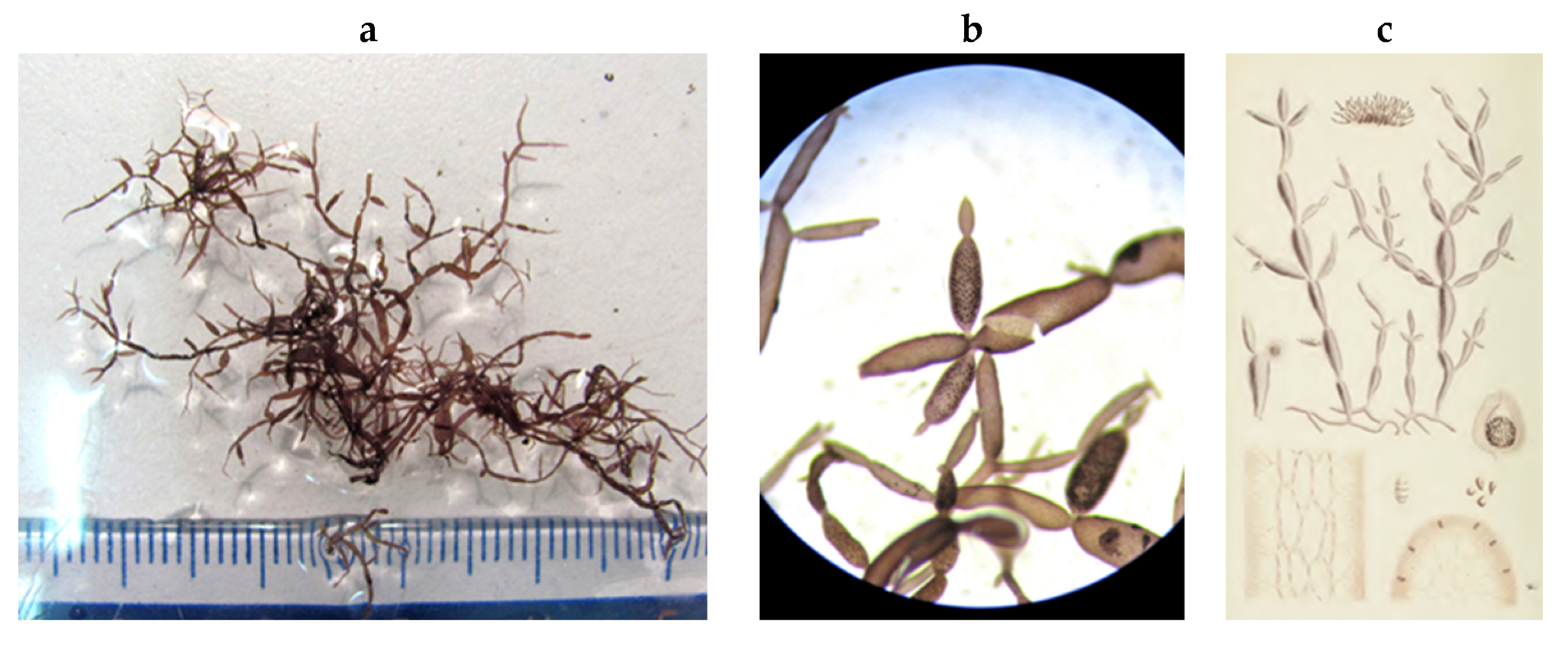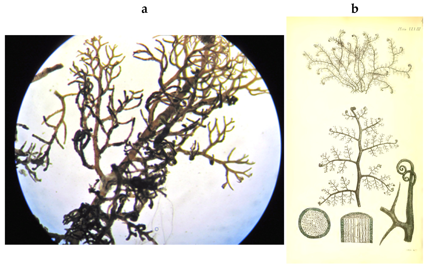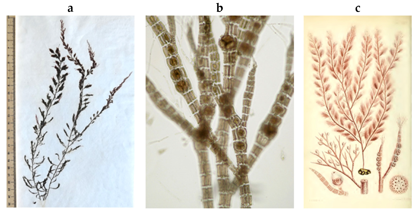 Description: Filaments are rigid, erect, and setaceous, with a deep dark green coloration. They exhibit di-trichotomous branching, with very acute axils and upright branches. Articulations are many times longer than they are broad, and dissepiments are present only at the points where branches and ramuli fork.