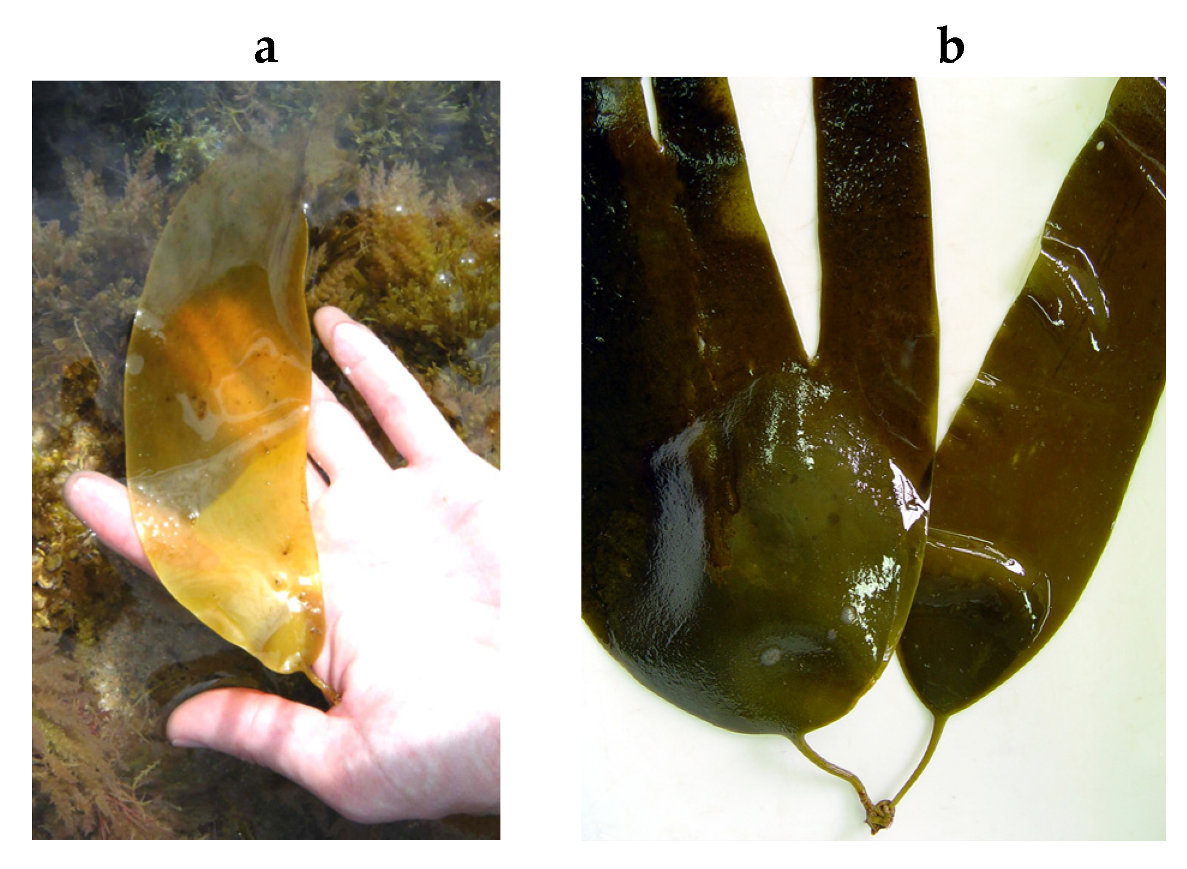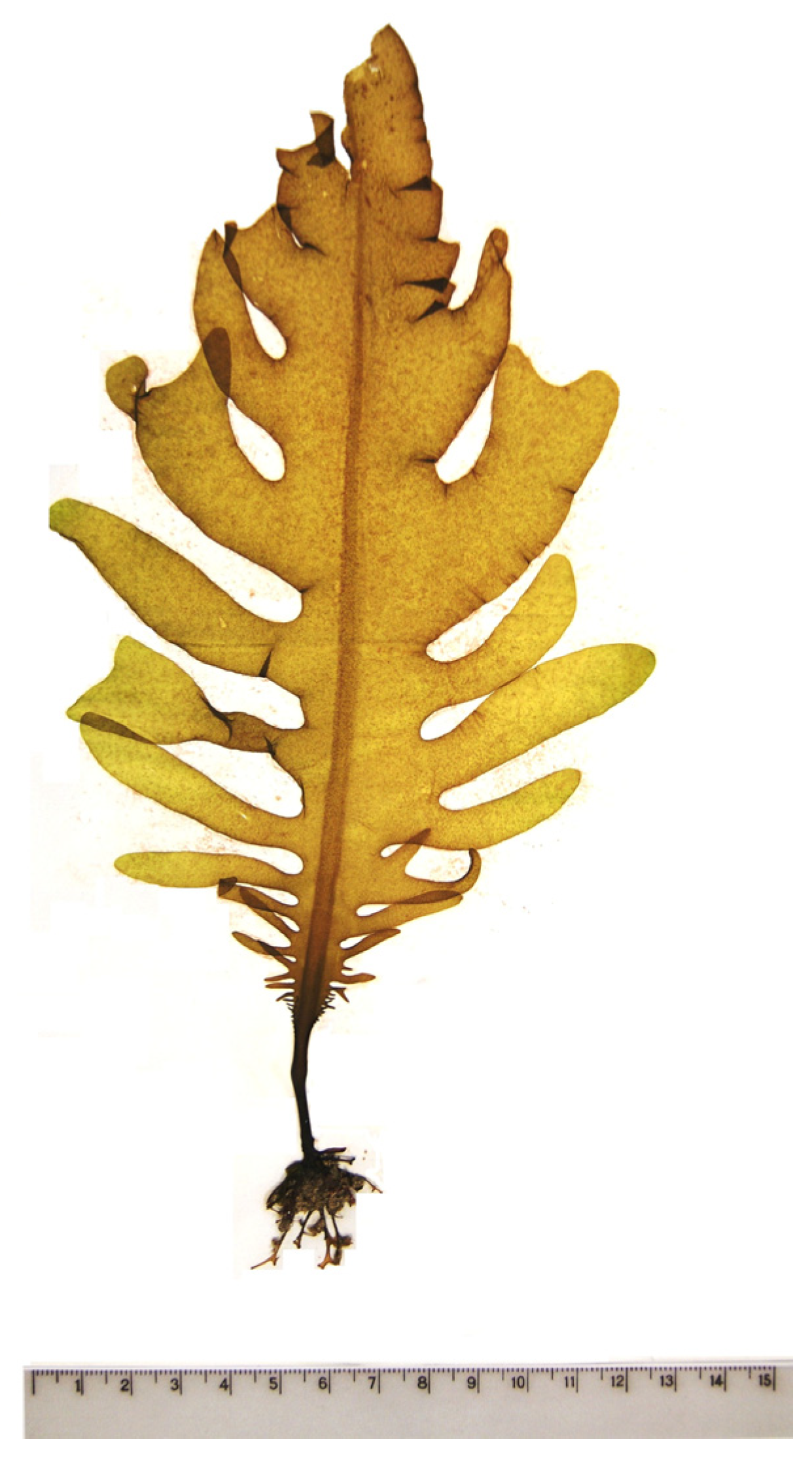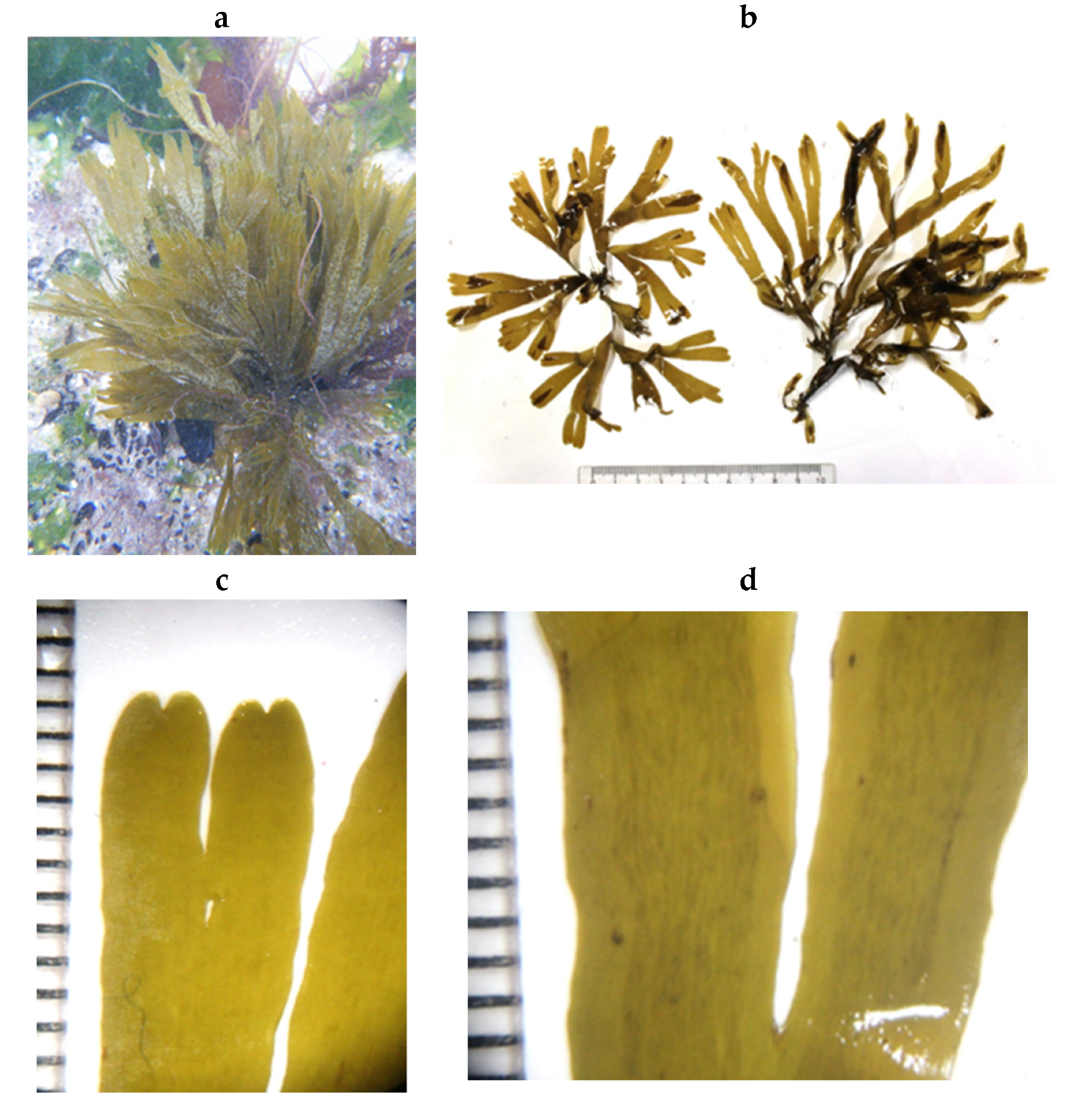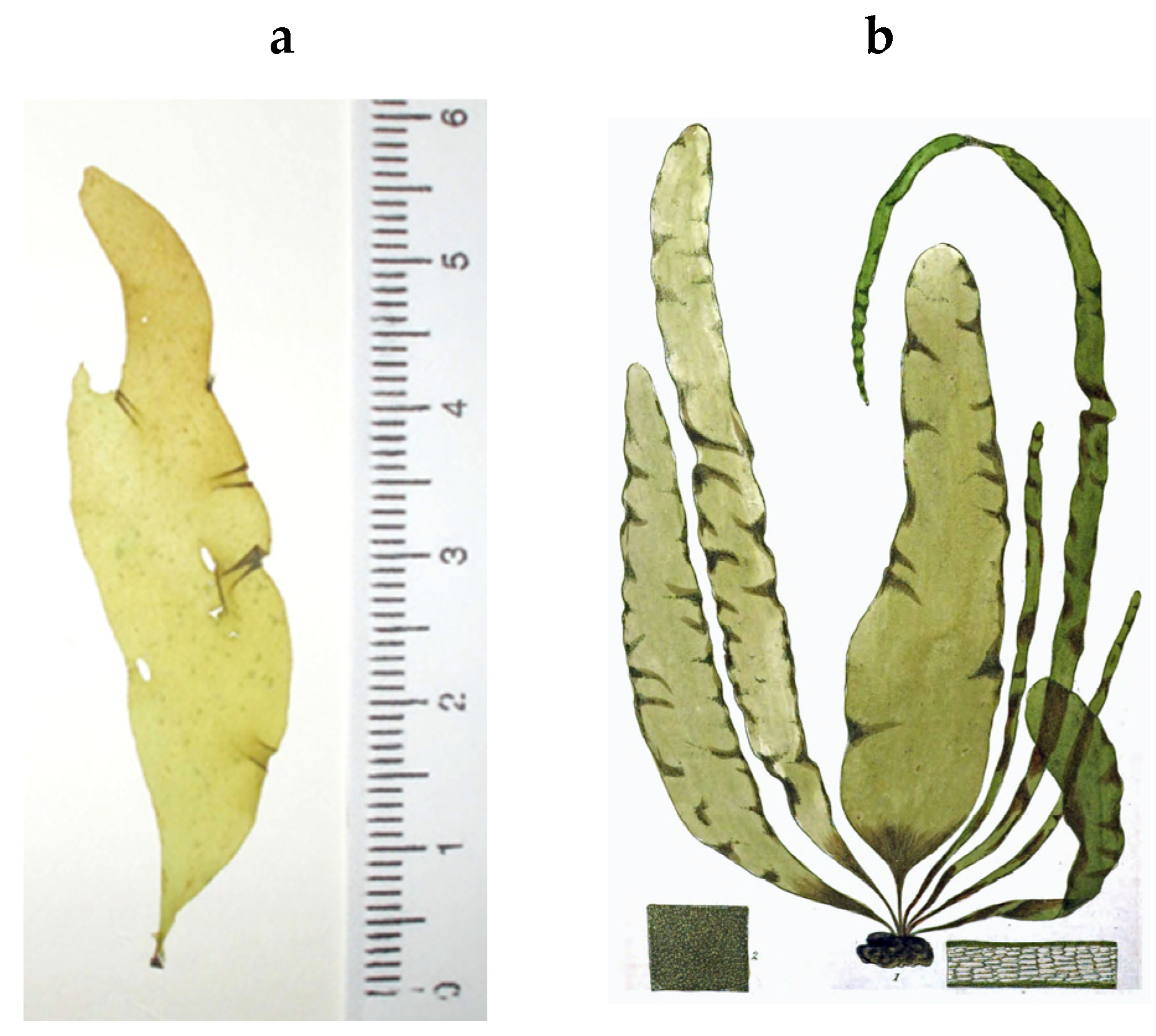 Description: The fronds of this species are erect, leaf-like, and flat, exhibiting a brown-red (liver-colored) translucency that gradually widens from the base. They may remain simple or become irregularly split or lobed at a narrow angle, often overlapping. Frequently, the fronds take on a distinct sickle shape, with smooth margins and a soft, slippery texture that does not proliferate. Cystocarps are minute and sunken, while the stipe is very short and stunted, anchored by a small discoid holdfast.