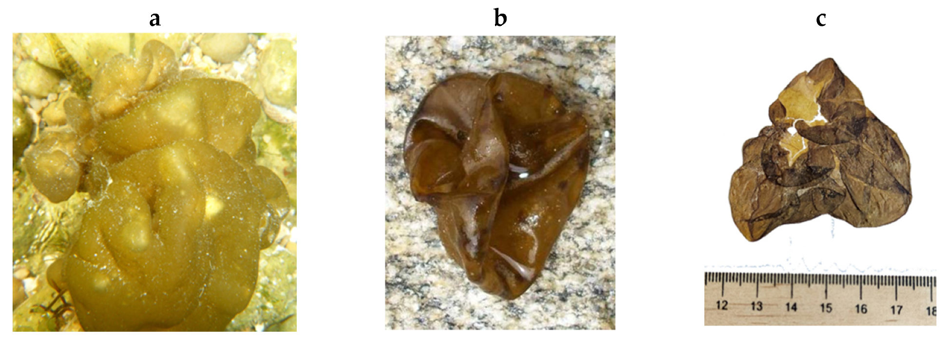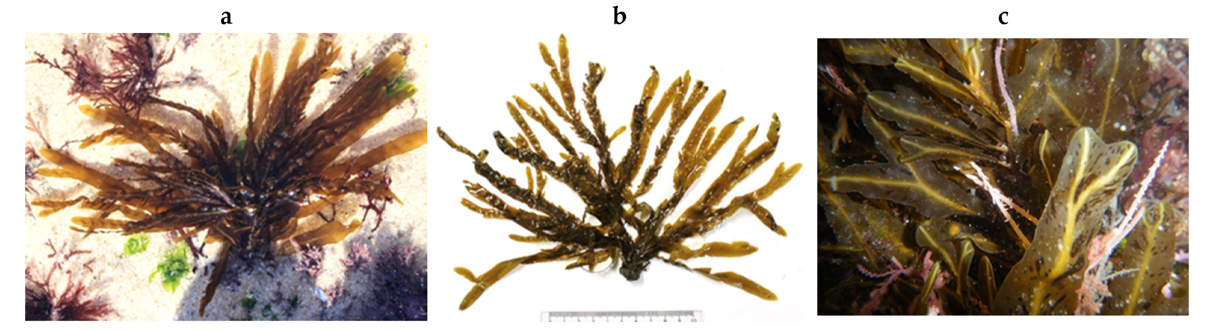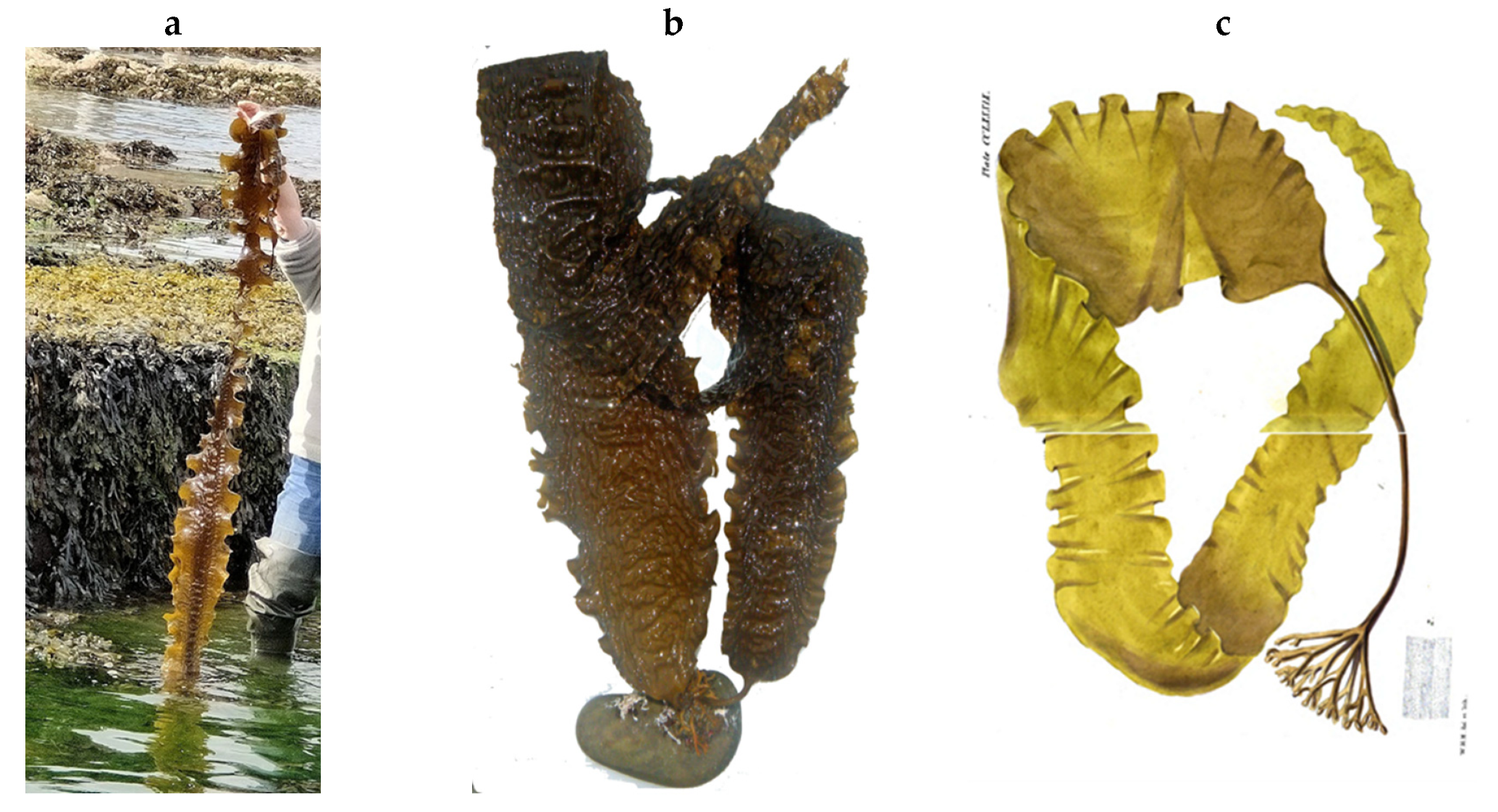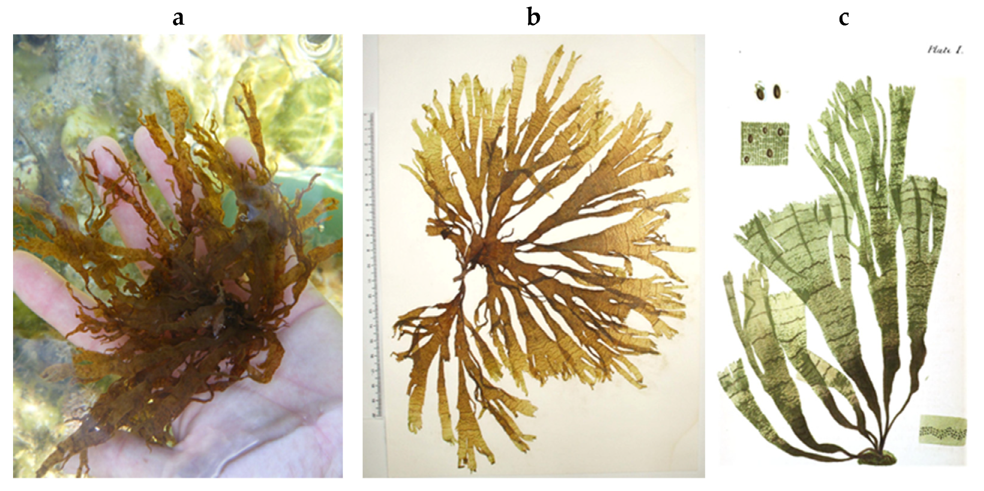 Description: The fronds of this species are erect, leaf-like, and flat, exhibiting a brown-red (liver-colored) translucency that gradually widens from the base. They may remain simple or become irregularly split or lobed at a narrow angle, often overlapping. Frequently, the fronds take on a distinct sickle shape, with smooth margins and a soft, slippery texture that does not proliferate. Cystocarps are minute and sunken, while the stipe is very short and stunted, anchored by a small discoid holdfast.