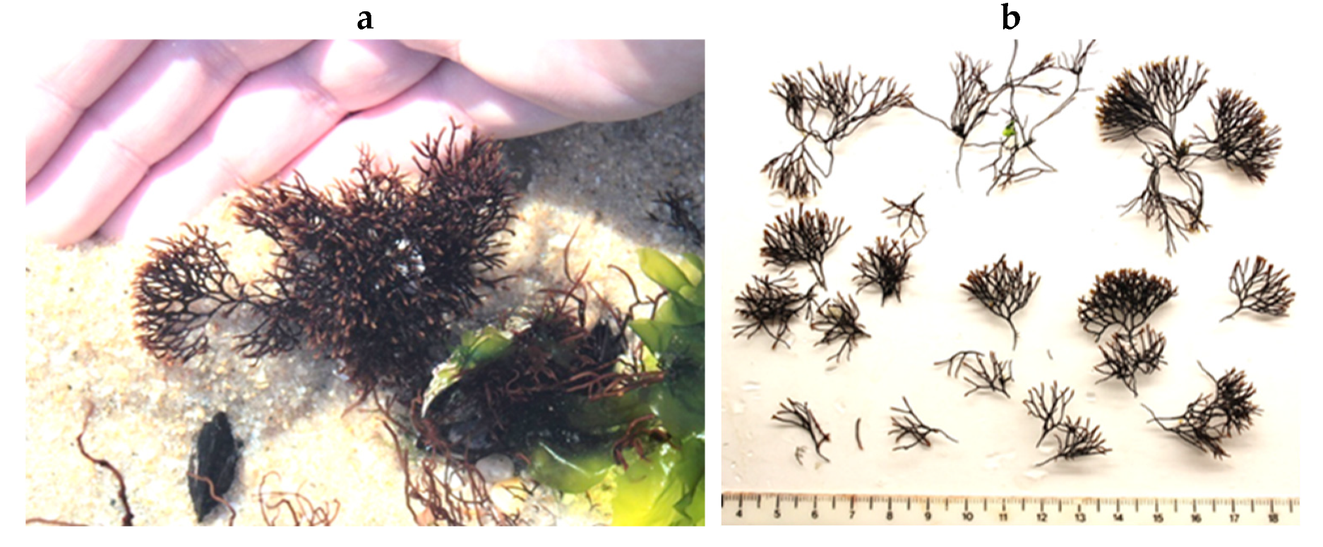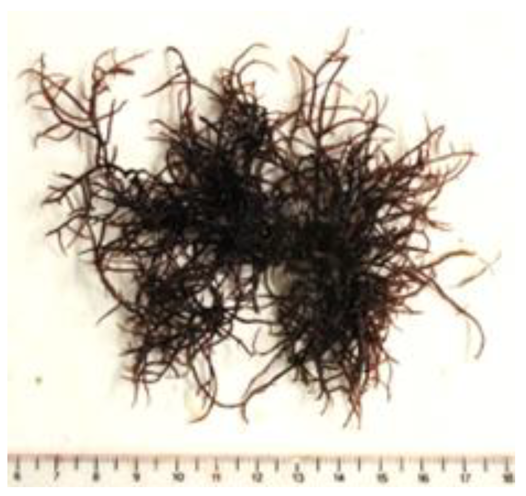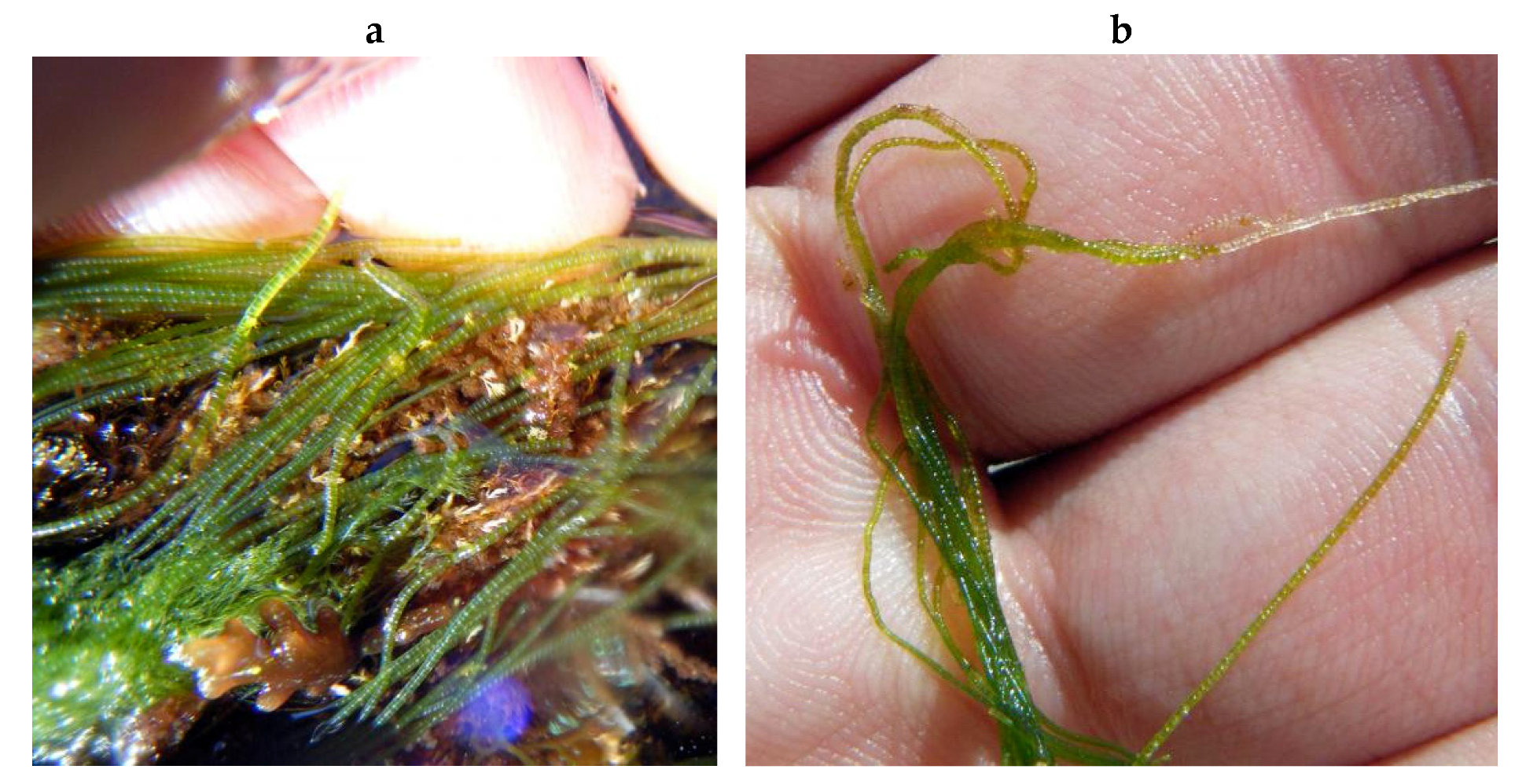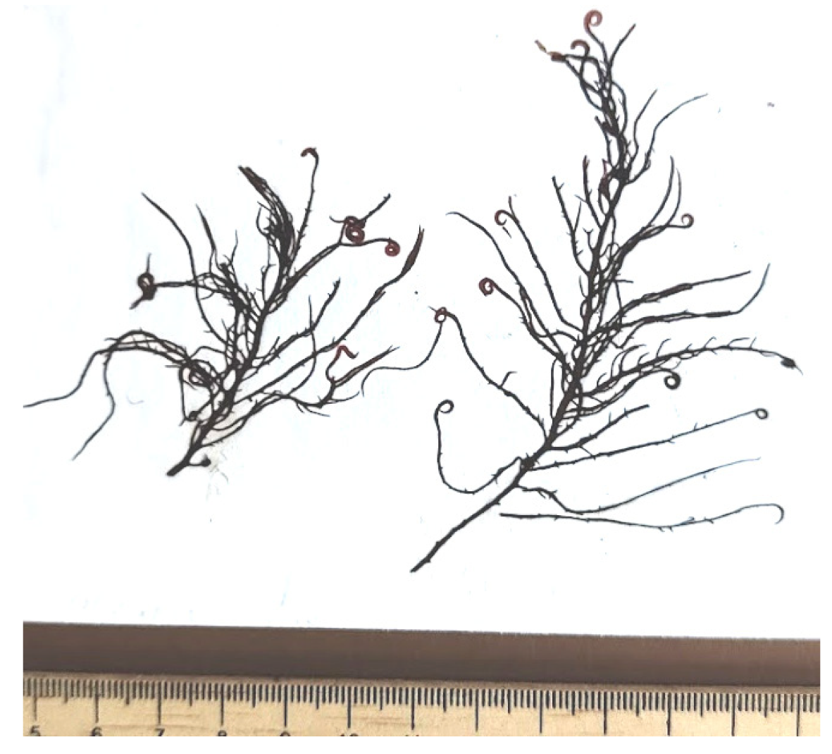 Description: The plants form mats or loosely arranged, fine entangled threads, measuring 50–100 mm in length. They are typically found in calm waters within the intertidal zone, growing on sandy or muddy substrates.