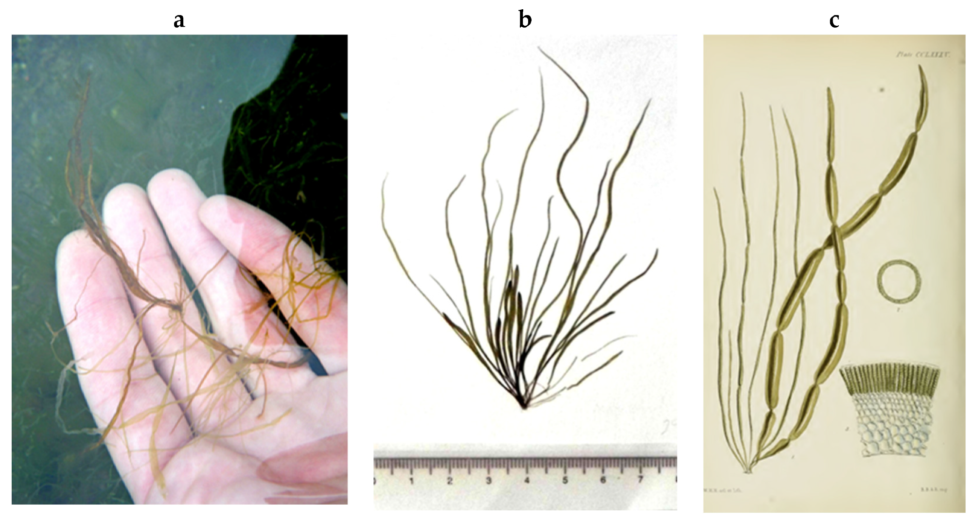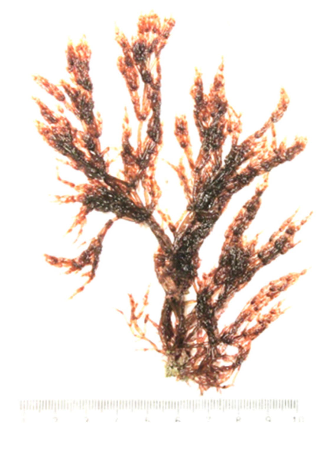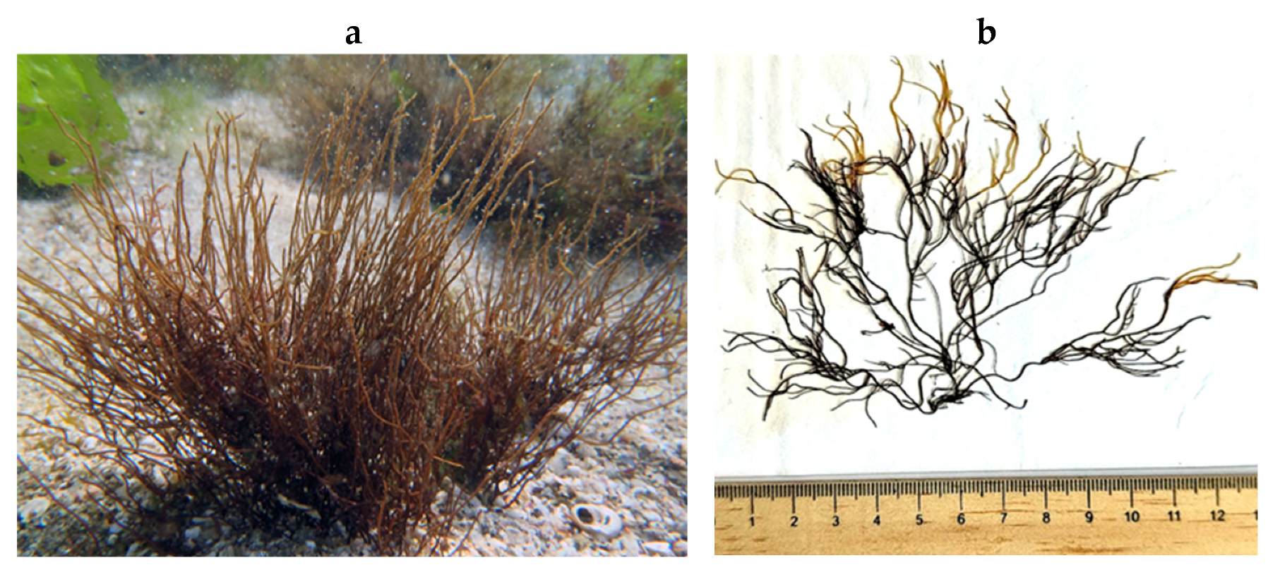 Description: The plants form mats or loosely arranged, fine entangled threads, measuring 50–100 mm in length. They are typically found in calm waters within the intertidal zone, growing on sandy or muddy substrates.