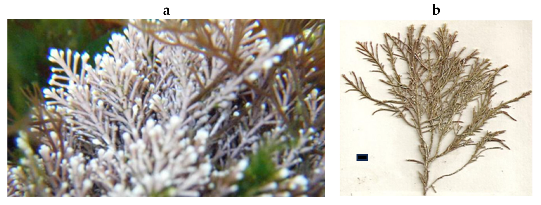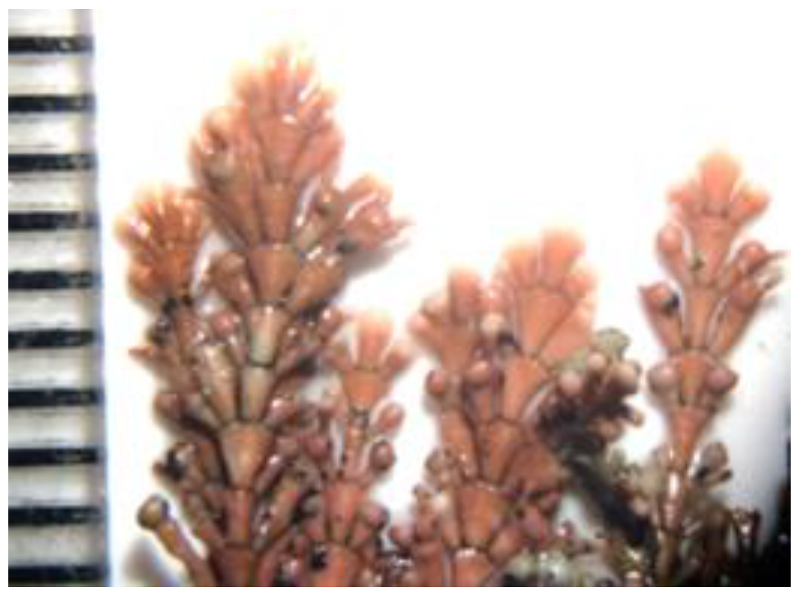 Description: Fronds are whitish-pink to reddish-lilac, calcified, with small articulations arranged in a fish-bone-like pattern. They reach up to 5 cm in height. The axis is compressed and repeatedly pinnate, arising from a discoid base. Reproductive structures (conceptacles) appear as swollen bodies in the terminal segments, accompanied by horn-like projections and a central pore (refer to detail in