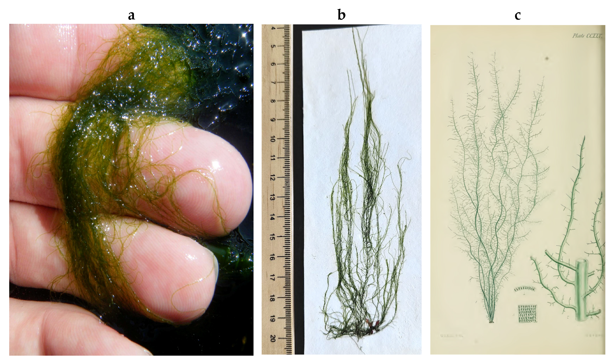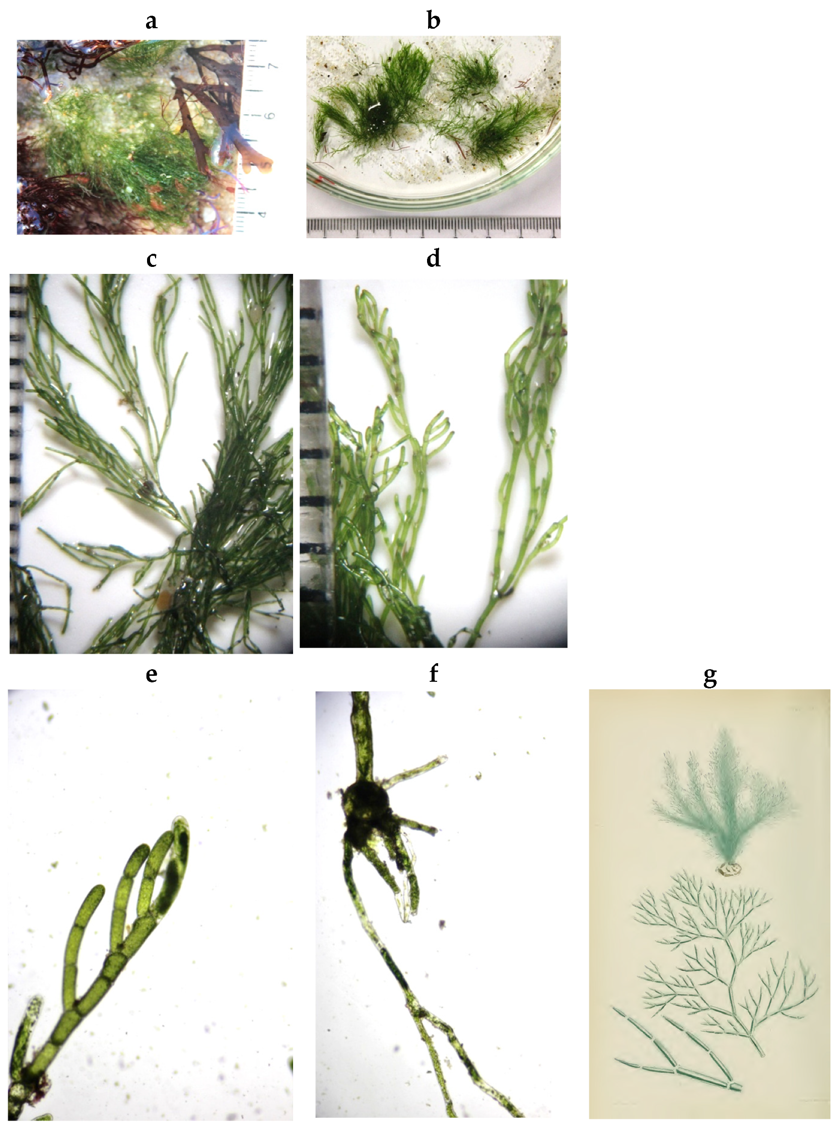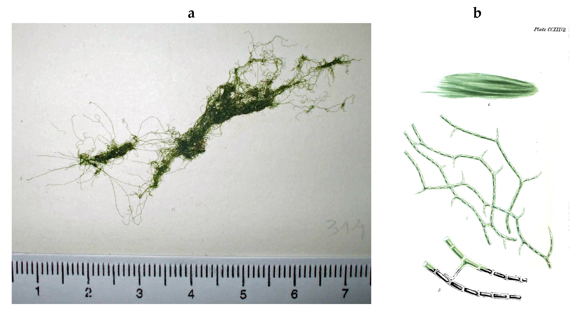 Description: The thallus is light to medium green, forming dense tufts ranging from 2 to 10 cm in height. Pseudo-dichotomous axes arise from a small cluster of rhizoids, which originate from cells in the basal region. Filaments exhibit only slight tapering and are branched from nearly every cell above the base, frequently bearing somewhat falcate, unilateral branchlets.