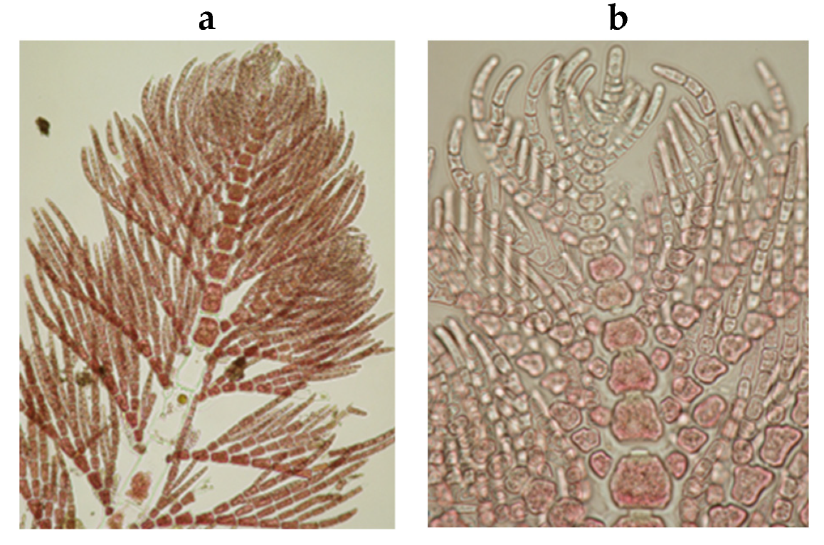 Description: The plants are erect and attached, composed of vivid green filaments that can reach up to 10 cm in height. Basal cells measure up to 1 mm in length and bear spreading, lobed rhizoids, from which additional filaments may arise. The filaments are cylindrical or slightly constricted at the cross-walls, with cells becoming barrel-shaped in the distal (fertile) regions. Cell diameters range from 150 to 200 µm just above the basal cell to 200–300 µm in the distal portions, with cells measuring 0.4 to 1.0 times as long as they are broad. Reproductive cells are formed at the apical ends of the filaments; they are barrel-shaped and approximately as long as they are wide.