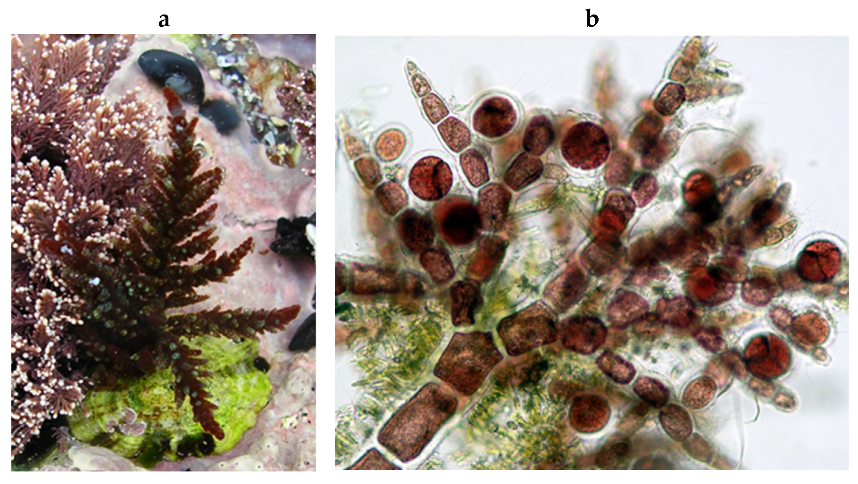 Habitat: Exclusively epiphytic, growing solely on the brown algae Cladostephus and Cystoseira in the lower intertidal zones of southern and western Britain and Ireland, where it is frequently abundant.