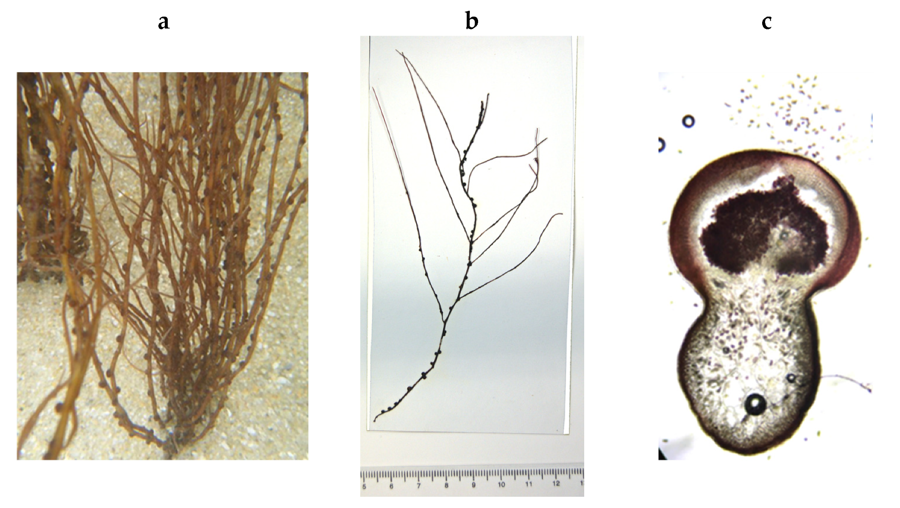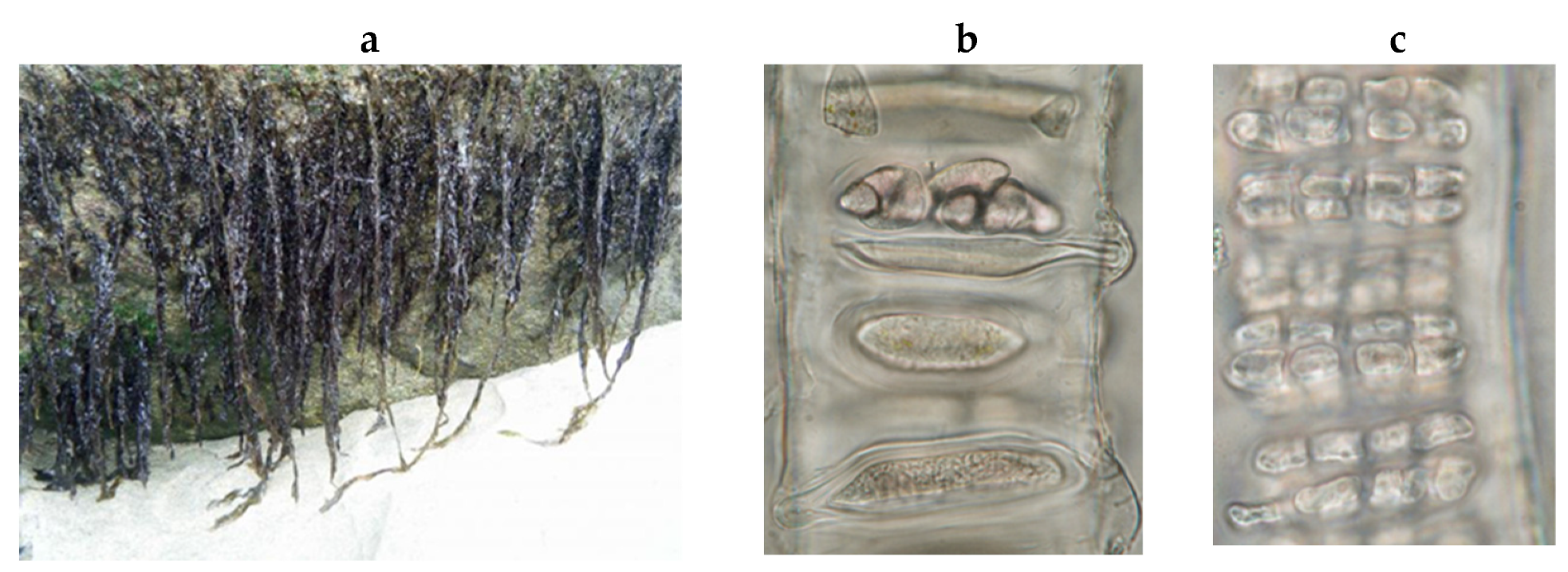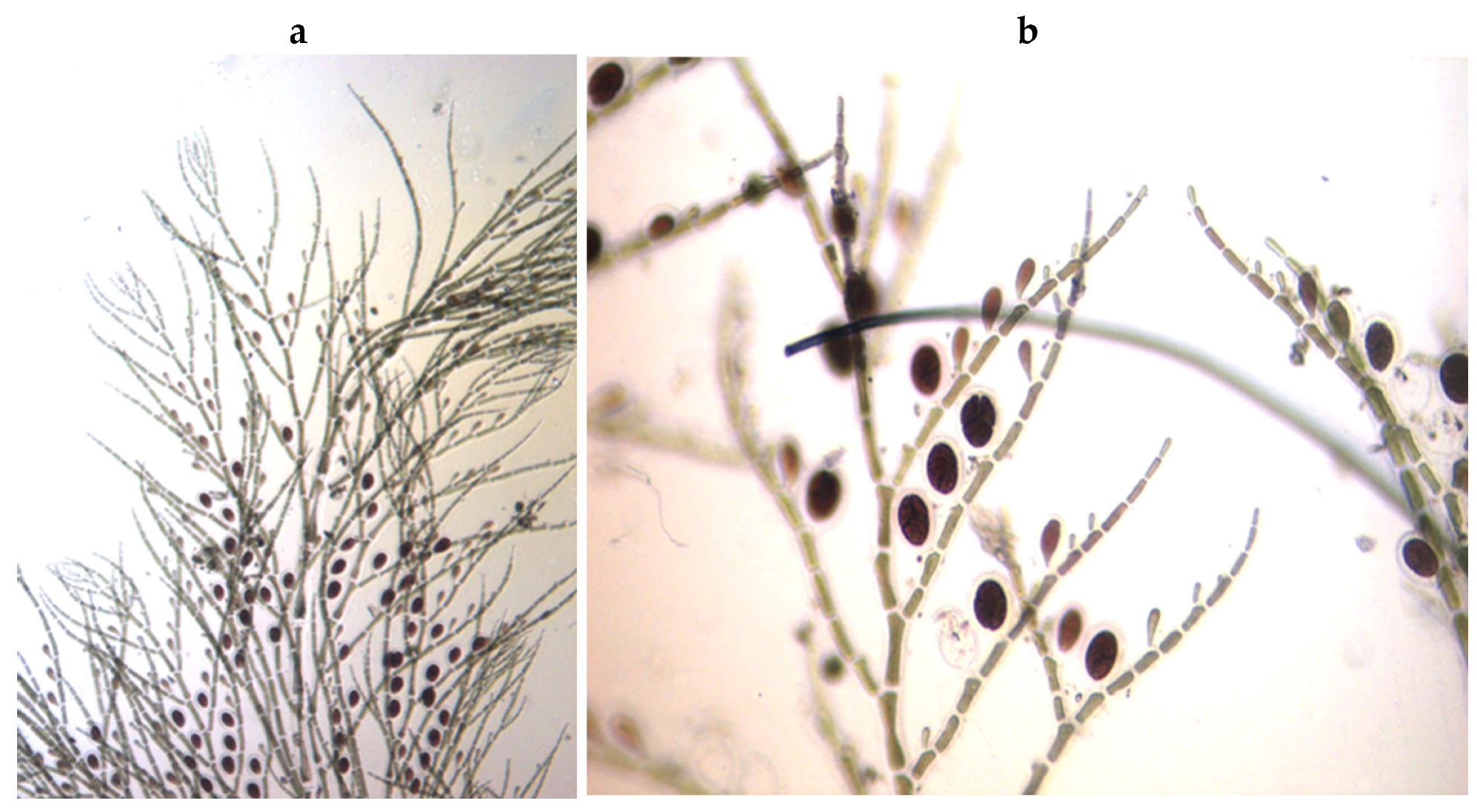 Description: The thallus is a dark green, tufted structure, reaching up to 10 mm in height. It emerges from an irregularly lobed, matted rhizoidal base and features numerous erect siphons that are sparsely branched. These siphons measure up to 120 µm in diameter at the base, gradually tapering to 50 µm near the tips. Double septa are occasionally observed at the bases of lateral branches. Chloroplasts are abundant, ranging from subspherical to lenticular in shape, with dimensions of 5–8 µm, each containing a pyrenoid. Sporangia are obovoid or pyriform, measuring up to 175 µm in length (including the pedicel) and 110–120 µm in diameter. They have a short pedicel and double septa at their base.