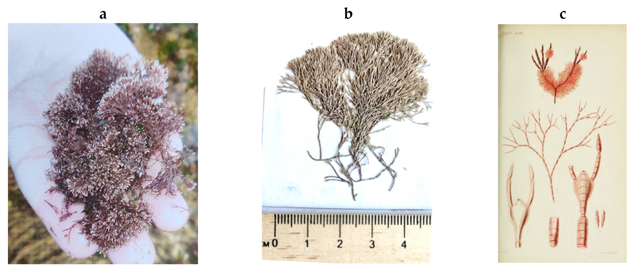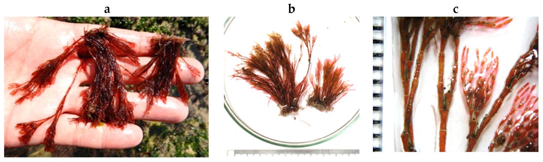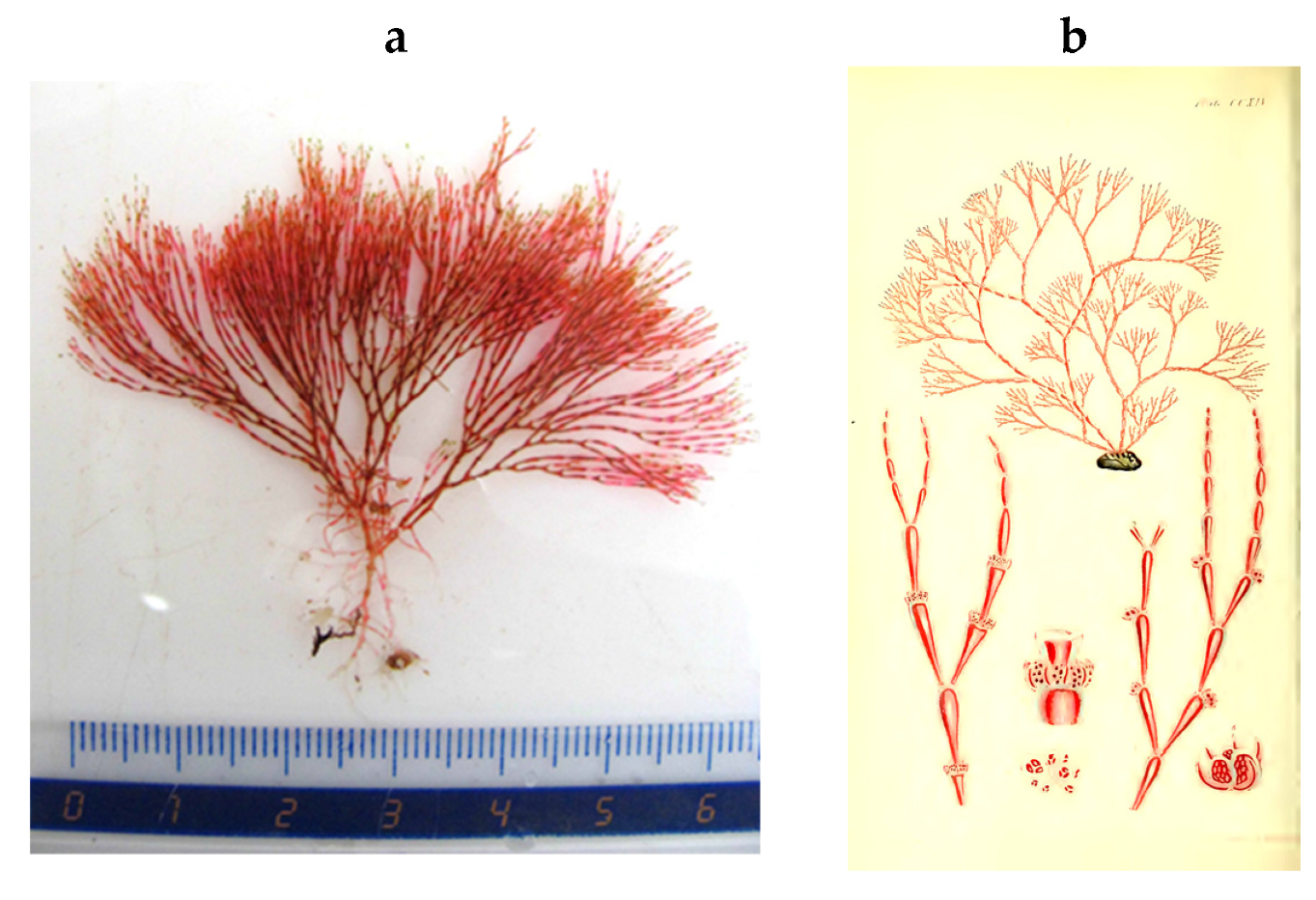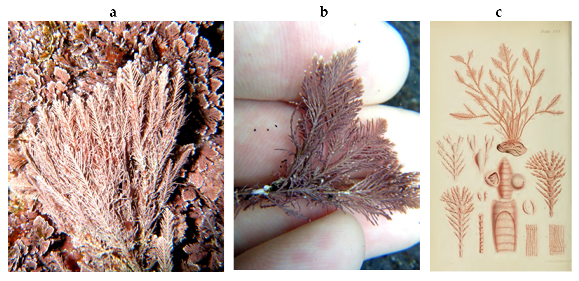 Description: Fronds are slender and rose-pink, articulated and calcified, reaching up to 50 mm in height. Branching is repeatedly dichotomous, with luxuriant specimens occasionally exhibiting secondary pinnation. Cylindrical segments measure up to 120 µm in diameter, while branch-bearing segments are slightly compressed, reaching up to 180 µm in diameter. The thallus is anchored by a small conical disk and is capable of vegetative propagation through the development of attachment disks on branches that come into contact with solid substrata.