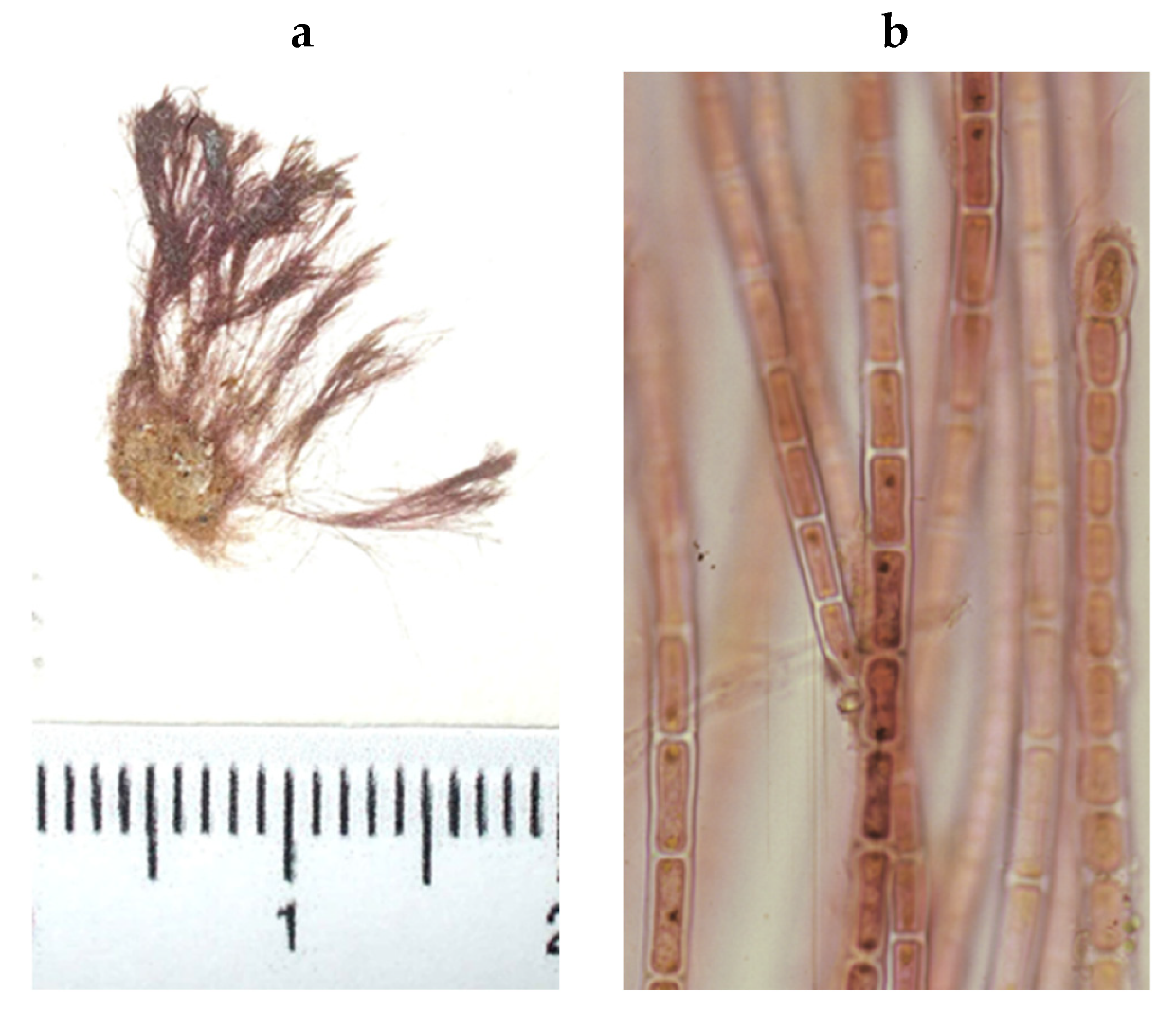 Description: Species with coarse filaments that are either unattached or basally attached. These filaments typically measure less than 0.5 mm in width and range between 3 and 5 cm in length. Composed of a single row of often swollen cells, they are attached, when present, through a discoid base or rhizoidal outgrowths. The plant’s structure adds to its distinctive appearance and adaptability.