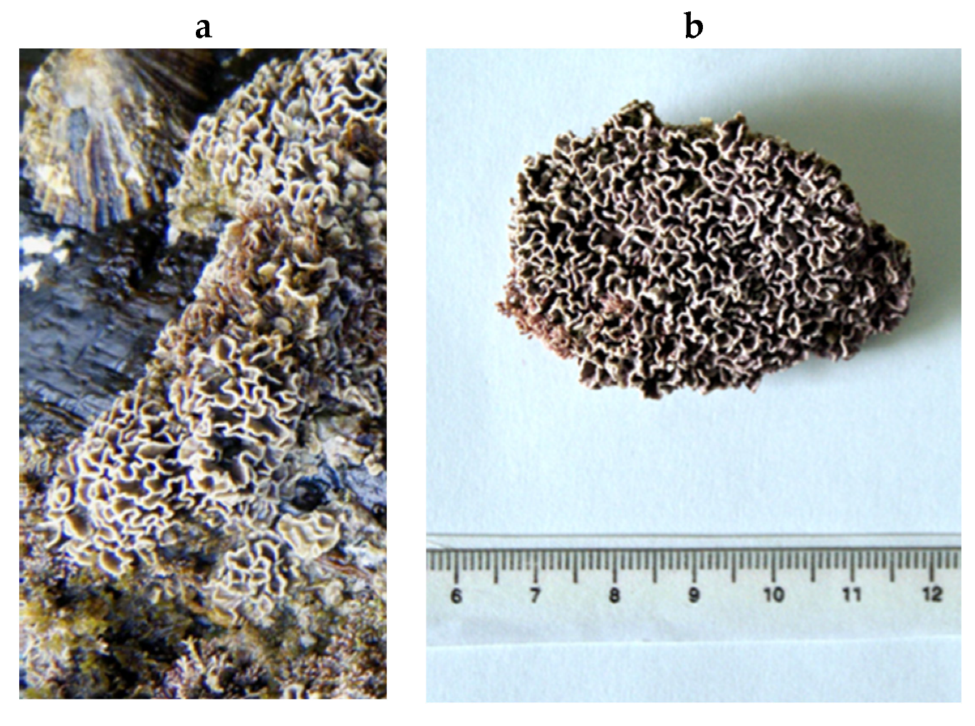 Description: This encrusting calcareous alga forms vertical lamellae that interconnect, creating more or less regular spaces between them, a few millimeters wide. It develops extensive crusts over rocky surfaces, reaching lengths of several dozen centimeters. Living specimens, gray-violet in color, form characteristic cushion-like clumps, and it marks the lower boundary of the mid-littoral zone and can provide shelter within its cavities for a fauna assemblage with affinities to the infralittoral zone.