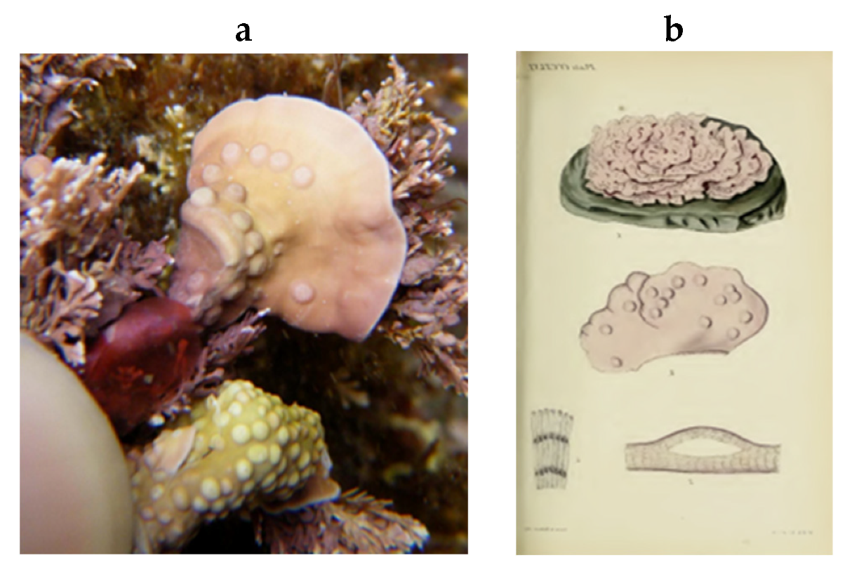 Habitat: This species is rare, typically found in the protected infralittoral and circalittoral zones, where it forms a coating on rocky surfaces shielded from intense light or settles in detrital environments with moderate water flow.