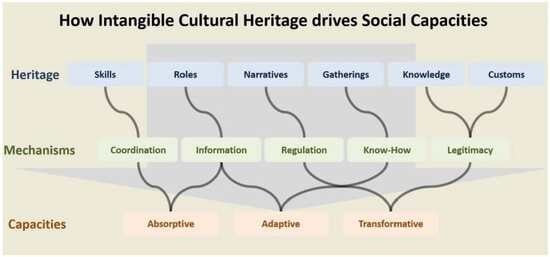 The definitions of societal resilience highlight the concept of bouncing back and forward and the ability to resist, absorb, accommodate, adapt to, transform, and recover []. This nuanced language moves beyond a simplistic notion of returning to a pre-crisis state. The emphasis on flexibility and the capacity to adapt to changing conditions [] implies that true societal resilience is an ongoing learning, evolving, and even transforming process in response to adversity. It suggests a proactive capacity for continuous adjustment and growth, rather than a passive recovery. The metaphor of ICH as a ‘cultural operating system’ [,] further reinforces this systemic view, highlighting that cultural heritage provides the scaffolding framework for continuous adaptation and evolution. Consequently, policies and interventions aimed at building resilience focus on post-disaster recovery, adaptive capacities, innovation, and sustainable development pathways that allow communities to emerge stronger and better equipped for future challenges.