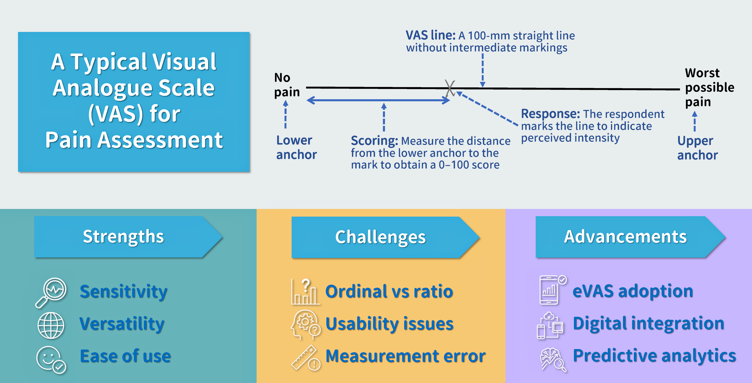 | Advantages | High sensitivity; ratio scale properties | Simple; widely used | Easy for patients with cognitive or literacy challenges | Culturally neutral; suitable for young children |