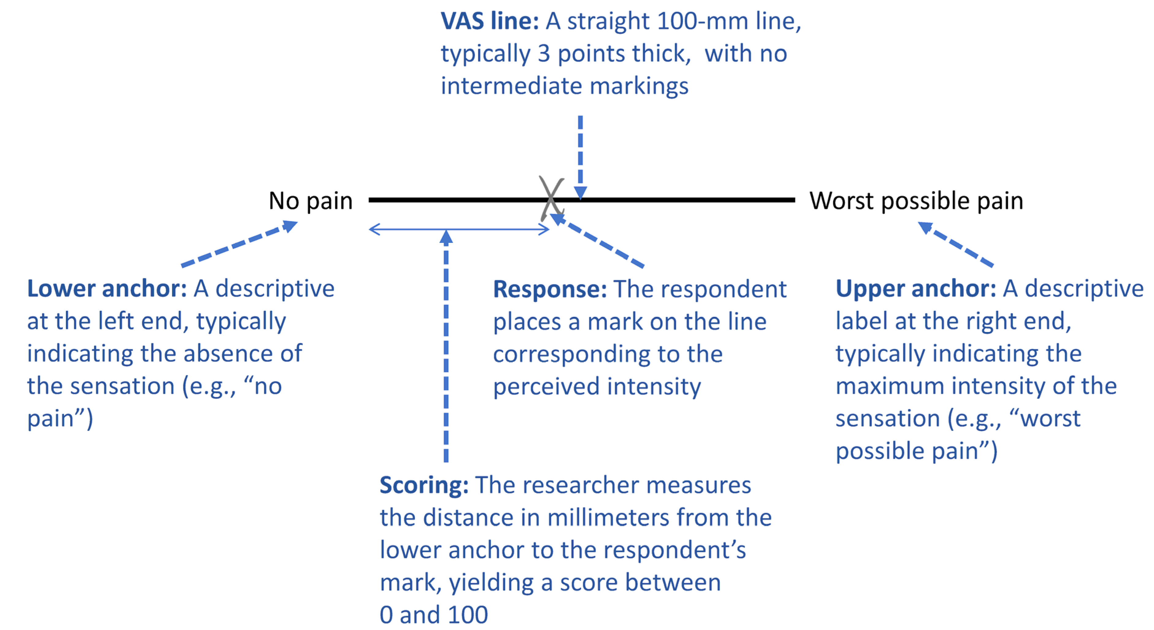 | Scoring | Millimeter measurement from left end (0–100 mm) | Numeric score from 0 (no pain) to 10 (worst pain) | Predefined categories converted to numeric equivalents | Score of 0, 2, 4, 6, 8, or 10 |