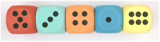 Petals Around the Rose [93] is a classic inductive puzzle in which a facilitator repeatedly rolls five standard dice (physical or online [94]) and announces the result for each throw; players must infer the underlying rule without it being stated, with the hint that the name of the puzzle is significant (Figure 1). The answer for each roll is determined by counting only the dots (“petals”) that surround the central dot (“the rose”) on each die: dice showing 3 contribute two petals each (the dots adjacent to the center), dice showing 5 contribute four petals, and all other faces (1, 2, 4, 6) contribute zero petals—since either they lack a central dot or have no dots around “the rose”.