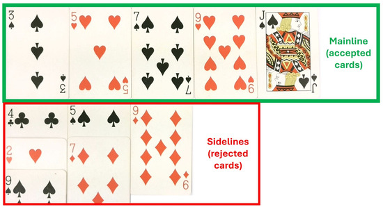 Building on these logics, Eleusis is a card game invented by Robert Abbot in 1956 [99] and revised in 1977 [100], in which one player acts as “Nature” and secretly defines a rule that determines which card plays are accepted. Other players submit cards in turn, attempting to discover the rule by observing which plays are accepted onto the mainline and which are rejected to the sidelines. As illustrated in Figure 2, the mainline displays the sequence of cards that correctly follow the dealer’s hidden rule (in this example, alternating spades and hearts, each exactly two higher than the previous card), while cards placed below the mainline (sidelines) represent incorrect attempts that did not satisfy the secret pattern and were thus rejected, creating a transparent record of both supporting and contradicting cases. At any point, a player who believes they have discovered the rule may declare themselves “Prophet” and take over the role of judging subsequent plays [101]. The dynamics of play require participants to generate hypotheses, test predictions, revise their thinking in response to new evidence, and defend their reasoning. This process operationalizes a hypothetico-deductive approach, mirroring how scientific theories are articulated, tested, and revised within a community [102]. Eleusis Express (Figure 2)—developed by John Golden—distills the core mechanics by removing the Prophet and allowing any player to state the rule publicly immediately after a correct play; the dealer confirms or denies on the spot, and a correct conjecture ends the hand [103]. Speed Eleusis is a version that accelerates play and, distinctively, introduces the possibility for Research Teams to “publish” their proposed rules, “replicate” the published rules of other teams if they agree, or “retract” prior claims if subsequent evidence undermines them, thereby closely mirroring the communal, competitive, and self-correcting features of real scientific practice [104]. Classroom research shows that with Eleusis and its variants, learners can map game roles and moves onto features of scientific practice [105], report high engagement and measurable improvements in students’ abilities to formulate hypotheses, interpret evidence, and argue from data [16], and achieve gains in NoS dimensions related to subjectivity and communal knowledge building [106].