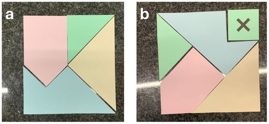 The Extra Piece activity. (a) Initial solution with original tangram pieces; (b) revised solution when a new piece (marked X) is introduced.
