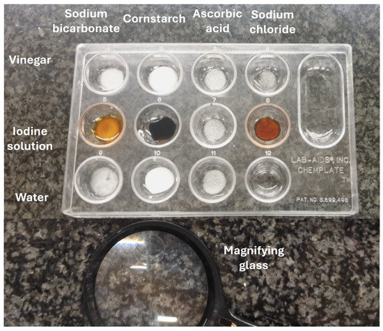 Extending the epistemic thread from Section 3.5—where the limits of evidence and the possibility of non-closure were foregrounded—while anchoring reasoning in disciplinary chemistry, a domain-authentic illustration is the classic mystery powders investigation. In its standard form [135,136], students analyze a set of common white powders (e.g., sodium bicarbonate, cornstarch, ascorbic acid, sodium chloride) using a magnifying glass to observe their physical properties, followed by systematic testing with three reagents: vinegar, iodine solution, and water (Figure 5). By carefully comparing the observable reactions of each known substance, learners establish diagnostic patterns. These tests are then repeated on an unknown white sample, which may correspond to one of the previously studied substances, a new substance, or a mixture. Students are thus challenged to identify unknown substances based on their observable properties and chemical reactivity, constructing evidence-based claims that mirror core scientific practices such as observation, inference, and argumentation from evidence [129,137]. Recent implementations convert this task into a competitive game or narrative-rich challenge [138,139], and some variants introduce a deliberate epistemic obstacle: after characterizing the reference powders, students are confronted with a “mystery” sample that may be or contain a substance not included in the initial set [140]. This design ensures that, even with systematic testing and careful argumentation, definitive identification is not always possible—forcing learners to grapple with uncertainty, acknowledge the limitations of empirical methods, and appreciate that some scientific questions may remain unresolved [14].