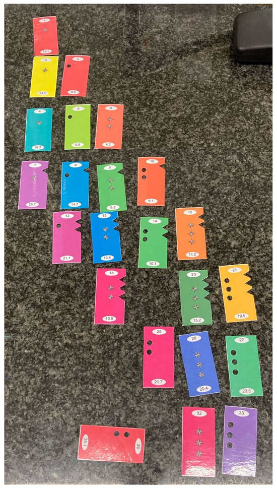 The Periodic Patterns Puzzle [141] marks a departure from this trend, offering a moderately contextualized activity anchored in the genuine historical and conceptual challenge faced by Mendeleev in constructing the periodic table. Rather than simply sorting items by superficial attributes [142], students must discern multidimensional periodicity, justify leaving principled gaps, and use observed patterns to predict the properties of a missing or unknown element—mirroring the creativity and inferential reasoning at the heart of Mendeleev’s achievement. In this task, students work with cards (the deck can be downloaded from [143]) that are characterized by several independent features, including color, numbers at the top and bottom, a central star whose number varies from card to card, and a variable number of triangles on the right side and holes on the left side; the activity often includes a “misfit” card, compelling students to negotiate what counts as a regularity, and how to deal with apparent anomalies [144]. Instructors usually opt to remove a card from the deck (cards 14 or 19 work well [141,143]), challenging students to predict its properties based on the arrangement of the remaining cards—an explicit analogue to Mendeleev’s strategy of leaving gaps in his periodic table and predicting the existence and characteristics of unknown elements (Figure 6). This puzzle compels learners to coordinate multiple attributes, defend gap-based predictions, and justify why a particular card cannot fit, thus engaging them in complexity, communal negotiation, and the tentativeness and revisability of scientific knowledge—all qualities that align with the true intellectual achievement of Mendeleev and situate the task as a robust platform for NoS instruction [141,144].