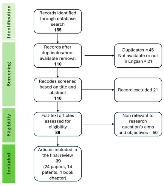 A total of 155 documents were retrieved from the electronic databases. 45 of them were excluded as duplicates, and 21 documents were not available or not in English. In total, 39 documents were included; 26 were labeled as Important and 13 as Relevant. Document screening led to the exclusion of 50 papers that failed to meet the inclusion criteria. Of the included ones, 24 are research papers, while 14 are patents, and 1 is a book chapter. The overall selection process of the reviewed documents is summarized in Figure 1, following a PRISMA-like flow diagram to illustrate the identification, screening, eligibility, and inclusion steps. PRISMA checklist has been uploaded as Supplementary Materials.