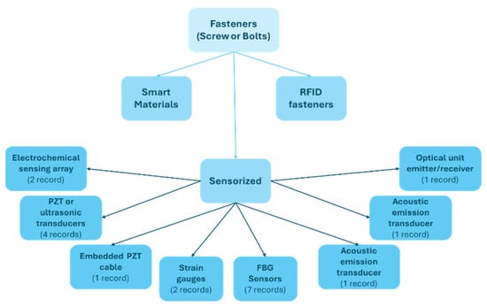 Results of the review have been divided into two main categories: screws or bolts (16 papers, 8 patents, and 1 book chapter) and washers (8 papers and 6 patents). Smart fasteners can be grouped into three main categories: