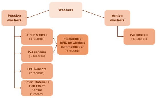 To the best of our knowledge to date, there are no studies focused on the systematic review summarizing the available technologies for smart fasteners and washers, both for structures and production systems.