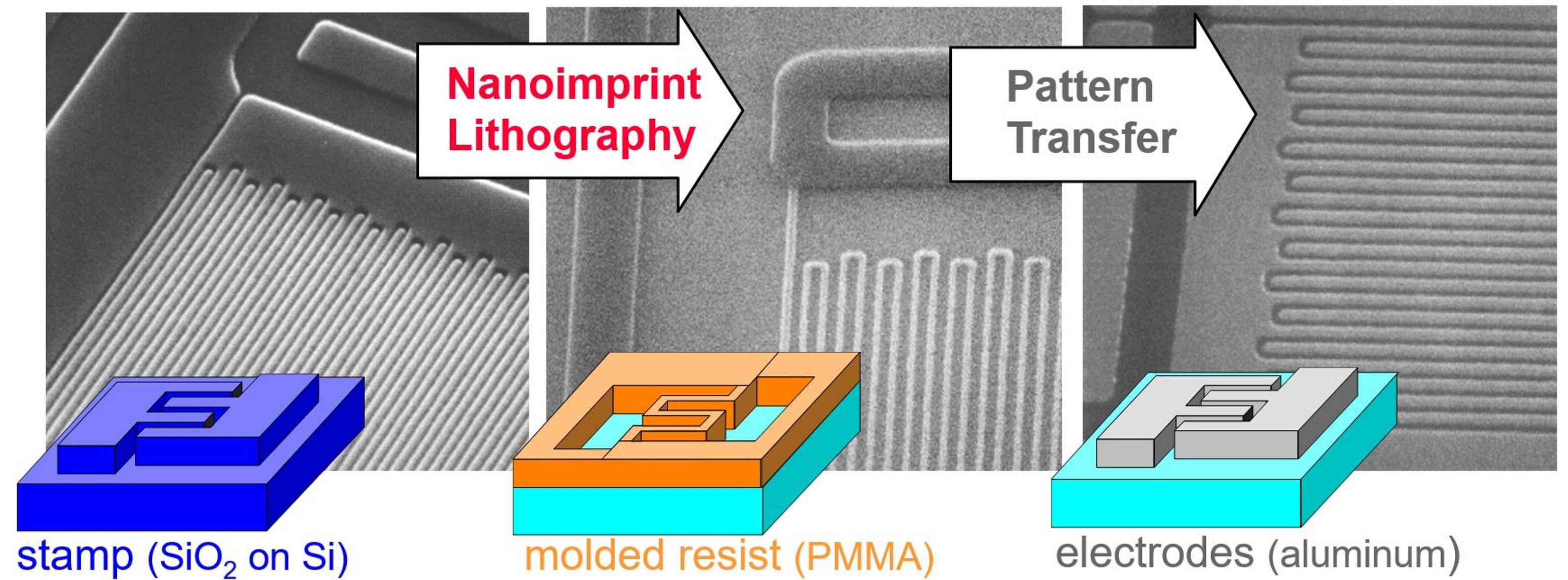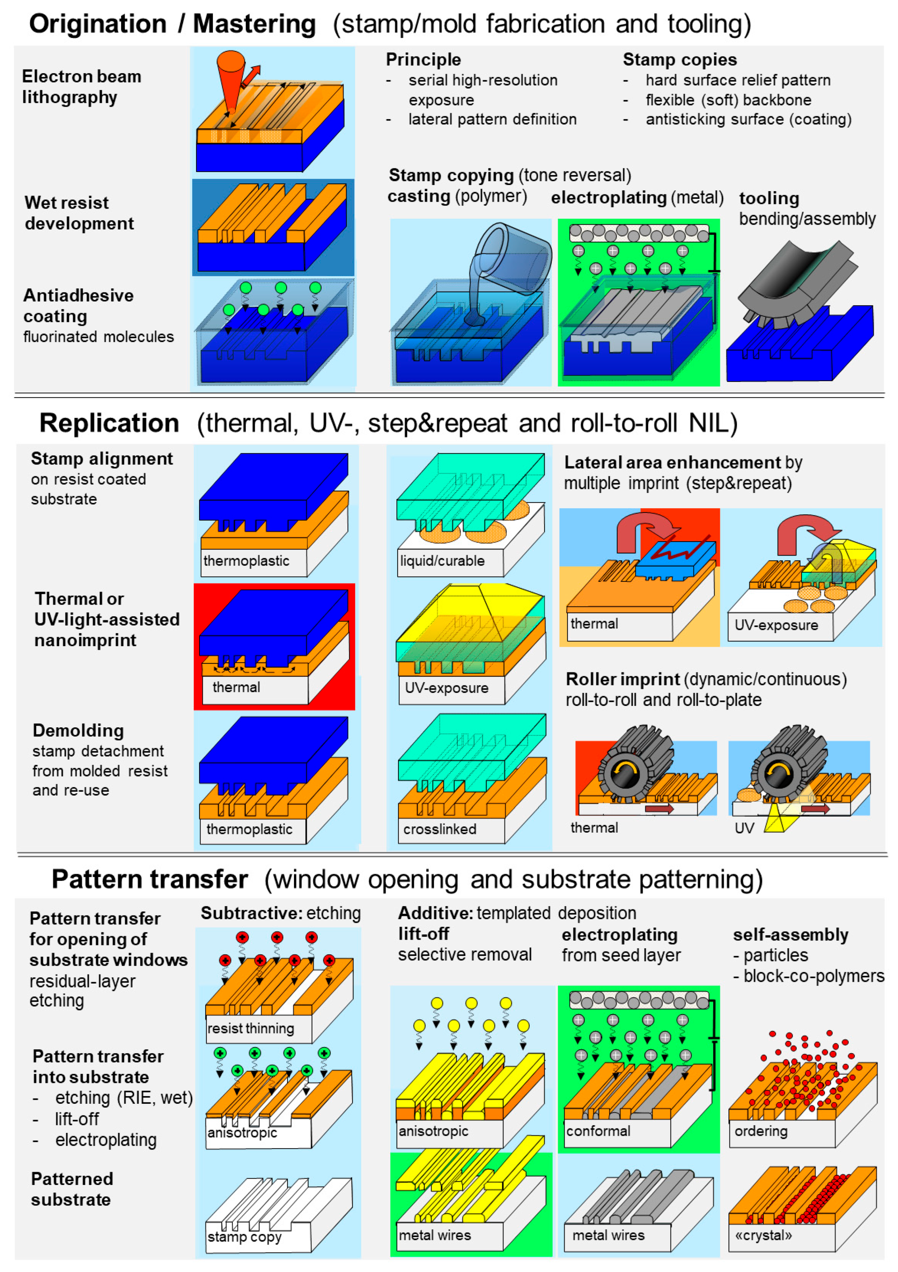 - Reversal imprint (R-NIL) is a technique where a resist is patterned via NIL, released from the underlying surface, and attached to another surface or already imprinted resist structure by bonding. Thus, multiple layers can be stacked, or resist structures can be transferred to surfaces that cannot serve as the imprinted substrate (e.g., due to mechanical restrictions) [40]. Similar approaches are now established for planarization on non-flat surface patterns, e.g., by droplet-based dispensing.