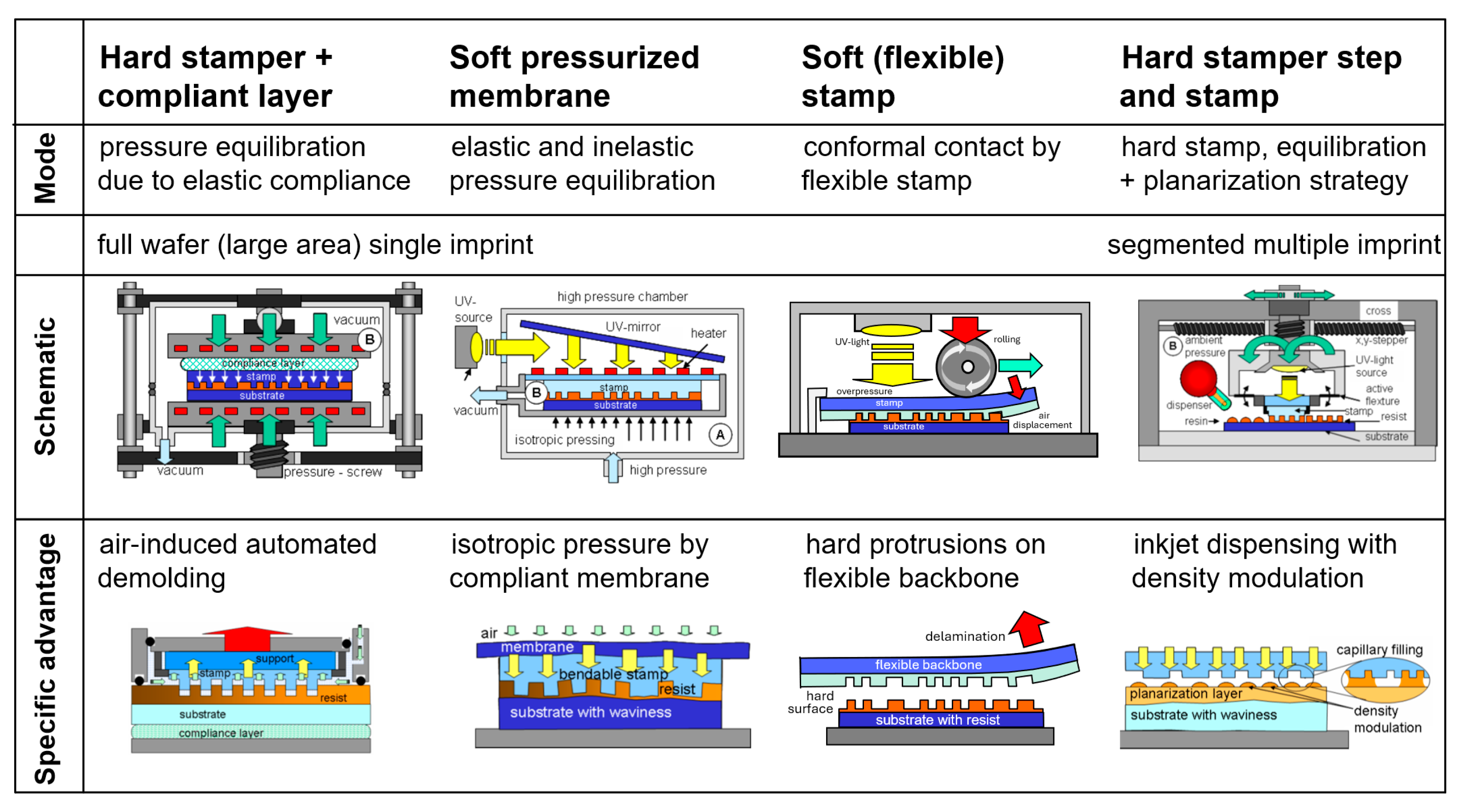- Imprint machines or presses enable manual, semi-automated, or automated process cycles. NIL tools are mechanically “simpler” than micro-embossing tools for high-aspect-ratio microstructures (HARMSTs), which require high mechanical stiffness to ensure purely vertical movement during molding and mold separation, and vacuum to avoid trapped air. NIL presses require vertical flexibility, i.e., membrane-based solutions that enable conformal contact and peeling. However, like projection-based steppers, alignment requirements of sub-100 nm or even in the nm range make NIL presses mechanically challenging. This involves mechanisms for approaching; pressing; displacement, dissolution, or compaction of air; demolding; and handling. For T-NIL, due to high viscosity, a pressure of up to 10 MPa (100 bar/1’450 psi) for squeeze flow is required, for UV-NIL, and a low pressure of only 10 kPa (0.1 bar/1.5 psi) for capillary filling.