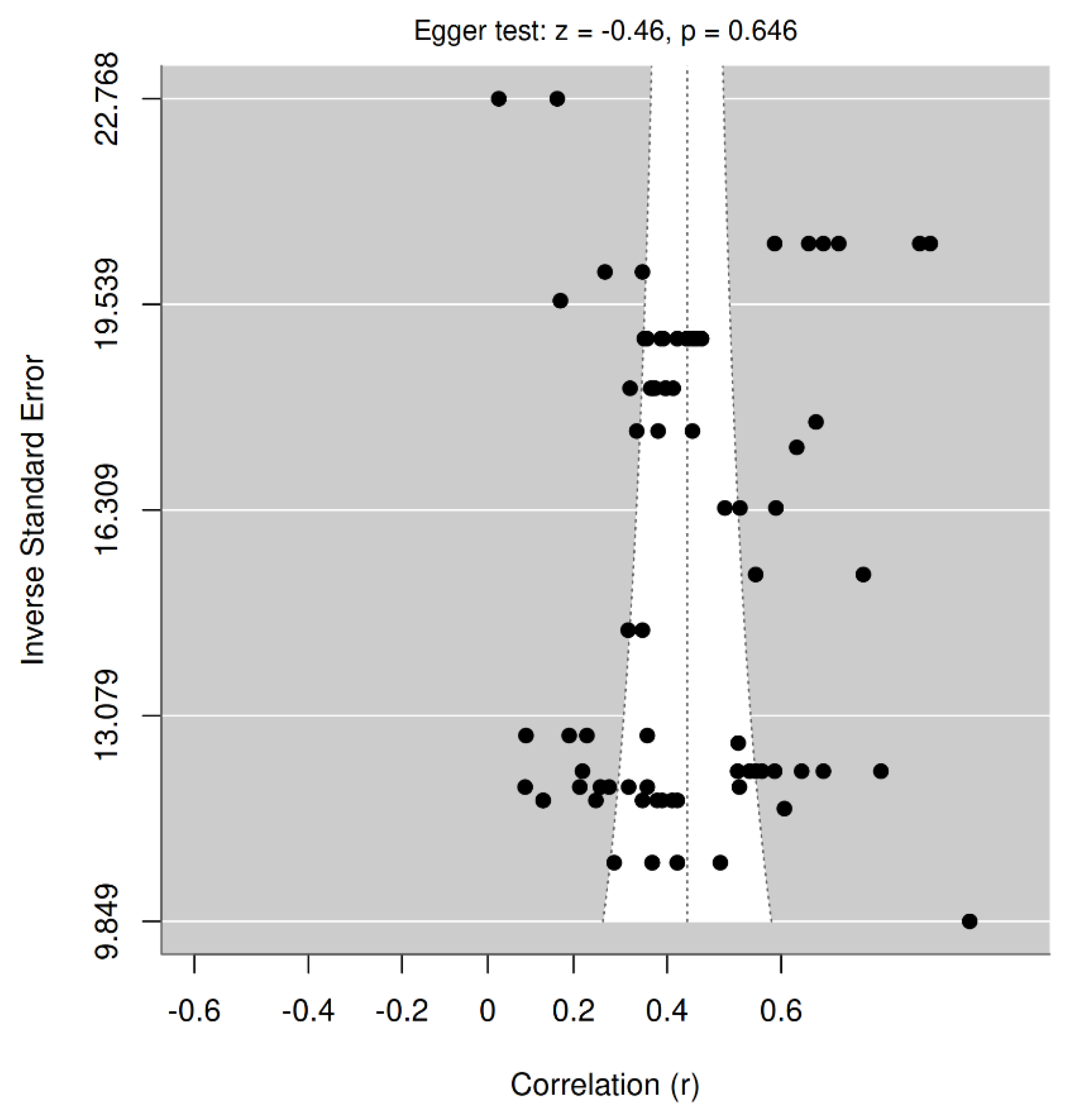 | Egger regression test | z = −0.46 | 0.65 | No evidence of funnel plot asymmetry |