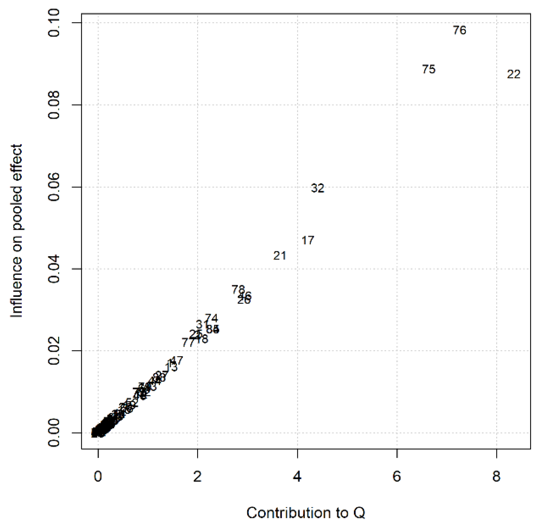 | Baujat plot (Figure 3) | - | - | Studies 22, 32, 75, 76 contributed most to Q |