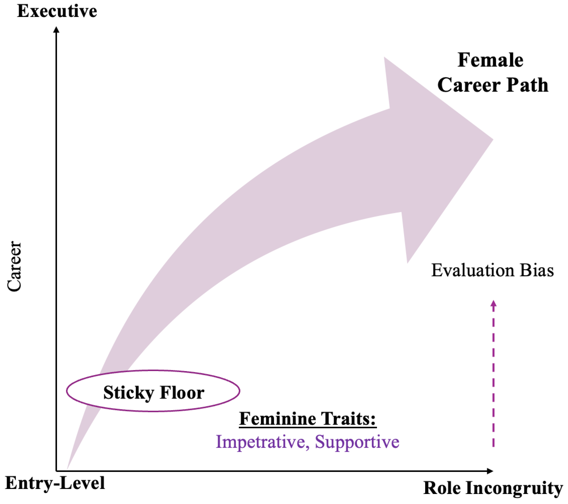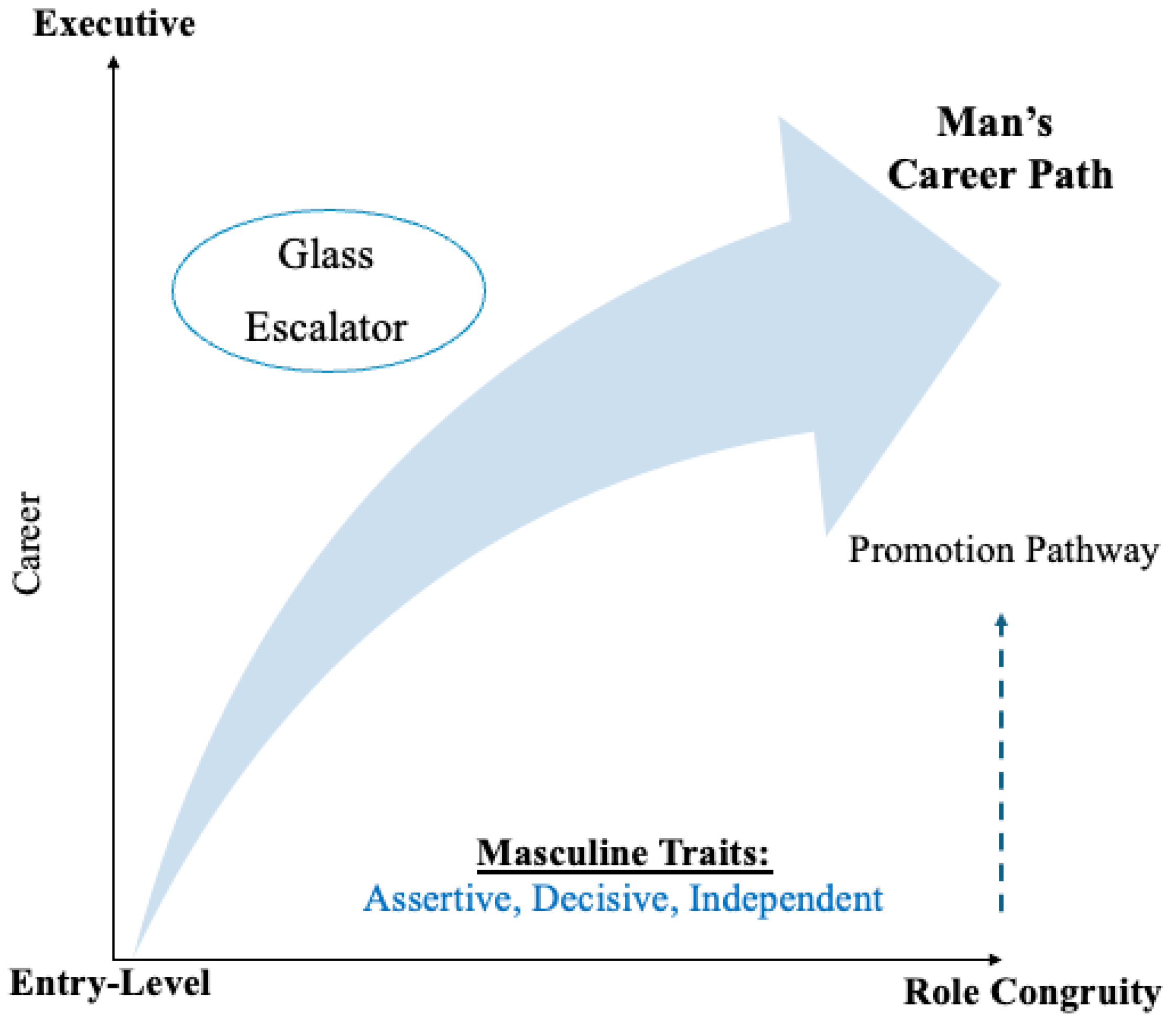 Figure 1 offers a stylized depiction of these dynamics by illustrating a typical male leadership trajectory within organizational hierarchies. The diagram shows how men’s careers often follow a relatively smooth and accelerating path from entry-level positions to executive roles. As indicated by the upward-curving arrow, early advantages—such as alignment with leadership prototypes, preferential mentoring, and institutional encouragement—tend to accumulate over time. These initial perceptions of legitimacy are gradually reinforced through ongoing organizational support, promoting continued upward movement across career stages. Importantly, the figure does not suggest that male advancement is automatic or effortless. Rather, it visually synthesizes how culturally and structurally embedded mechanisms—well documented in existing research—shape both the direction and pace of male career progression within hierarchical organizations.