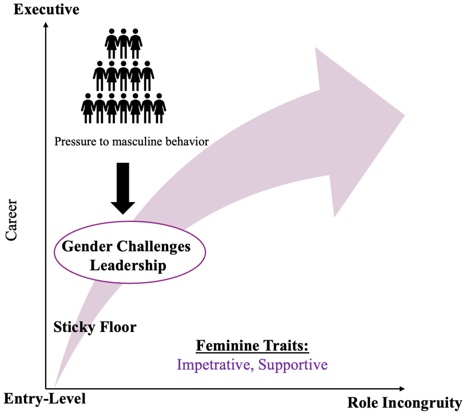 Figure 3 visually synthesizes these mechanisms by showing how gender increasingly challenges leadership during the mid-career stage. As illustrated, women’s upward trajectories are progressively shaped by the pressures of role incongruity as they advance beyond entry-level positions. With each step, women face intensified expectations to conform to masculine-coded leadership norms while simultaneously being judged according to feminine behavioral standards. In this context, leadership itself becomes a contested domain for women—one that must be continually negotiated under scrutiny, where gender directly challenges the enactment of leadership.