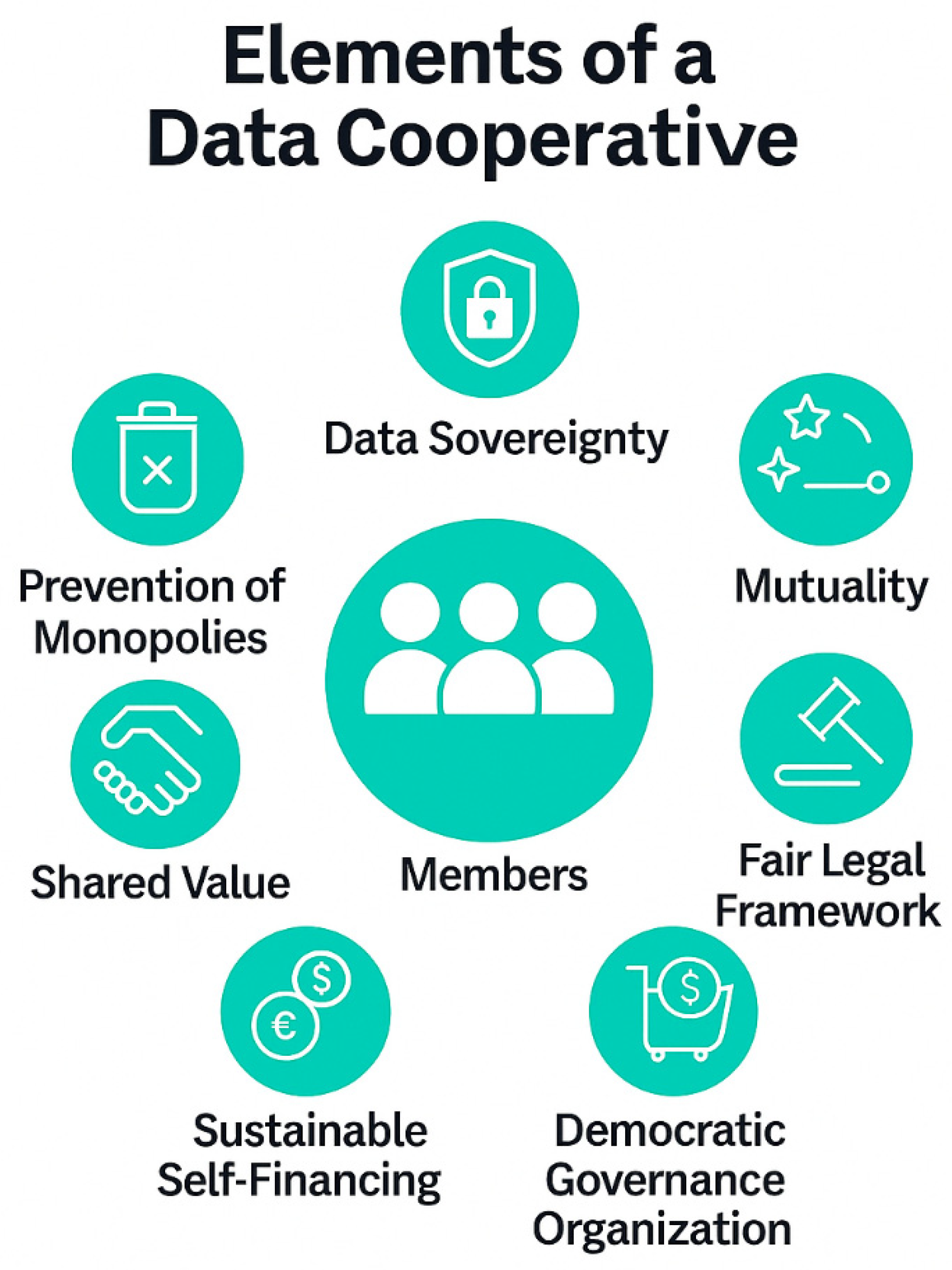 9]). At the same time, data cooperatives need to develop a strategy for long-term self-financing to avoid external dependencies and maintain autonomy of action. The generation of shared added value forms the economic and social starting point: the resulting benefits are not skimmed off to third parties, but flow back into the community of members. Finally, the principle of monopoly avoidance aims to prevent concentrations of power within and outside the cooperative and to secure open, competition-promoting structures (cf. [