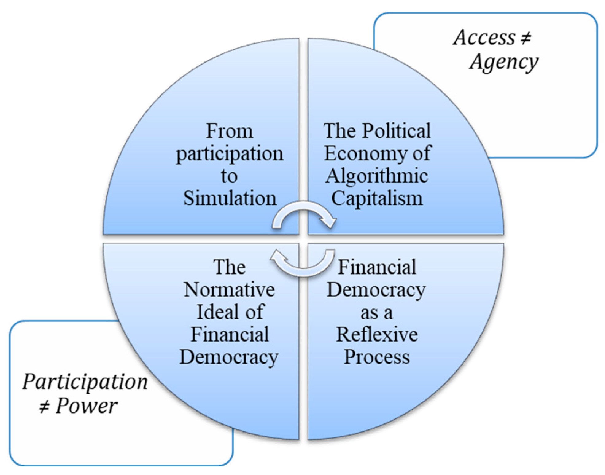 29] and digital citizenship. In these theories, democracy is not viewed as a fixed institutional arrangement, but rather as a dynamic process of negotiation between various centres of authority, including states, markets, and platforms. Financial democracy requires more than just technological inclusion or market participation. Rather, it is an evolving equilibrium between openness and control, visibility and opacity, and empowerment and dependence. Financial democracy should therefore be understood as an ongoing negotiation between technology, social inclusion and institutional design. Its future depends on citizens’ ability to convert digital connectivity into political agency, thereby transforming the infrastructures of finance from instruments of market expansion into arenas of democratic contestation.