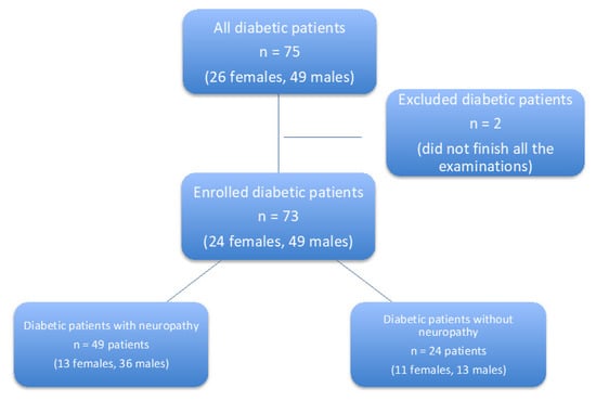 This case-control study involving patients with type 2 diabetes mellitus with and without microvascular complications was performed in accordance with the principles of the Declaration of Helsinki for experiments involving humans. All participants initially signed an informed consent to the scheduled examinations. A thorough history of patients was recorded, with a focus on the treatment and duration of diabetes, its complications, medication and possible cardiovascular disease. The enrolled patients were diabetic patients in long-term management—in 16% of cases with oral hypoglycemic agents (OHA), 53% of patients with insulin therapy + OHA and 15% with insulin monotherapy. As for macrovascular complications, 85% of patients had arterial hypertension, ischemic heart disease in 5%, ischemic lower limb disease in 2% and stroke in 1% of cases.
