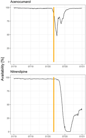 Overall, we identified n = 2 drugs with an availability decrease of more than 20% (Figure 1): acenocoumarol (decrease by 51.99%) which is a vitamin K antagonist (VKA), and nitrendipine (decrease by 98.27%), which is ant–Ca. Drugs with an availability decrease between 5 and 20% are shown in the Supplementary information (Figure S1). The basic characteristics of availability for each of the two drugs are shown in Table 1. Nitrendipine reached the nadir of nearly complete inaccessibility in the sample of pharmacies across Poland, while acenocoumarol was still available in nearly 48% of pharmacies. After a significant period of decreased availability, the supplies of acenocoumarol stabilized and reached the level, which could be found before COVID-19 pandemics. The situation with nitrendipine availability looks much more different. After the decrease in availability, the level of nitrendipine supplies stays much lower than before novel pandemics.