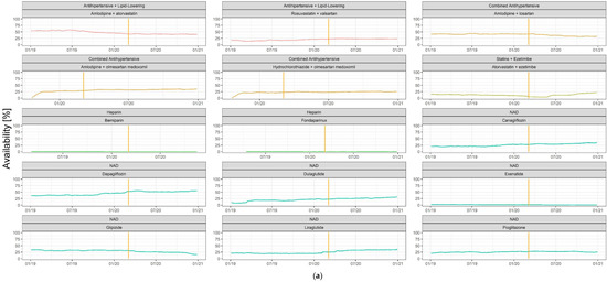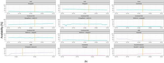 Drugs with median availability below 50%. The 7-days moving average was used. Orange lines indicate the date 4 March 2020, the first confirmed case of COVID-19 in Poland. The figure is divide into two parts (a) and (b) for the sake of readability.